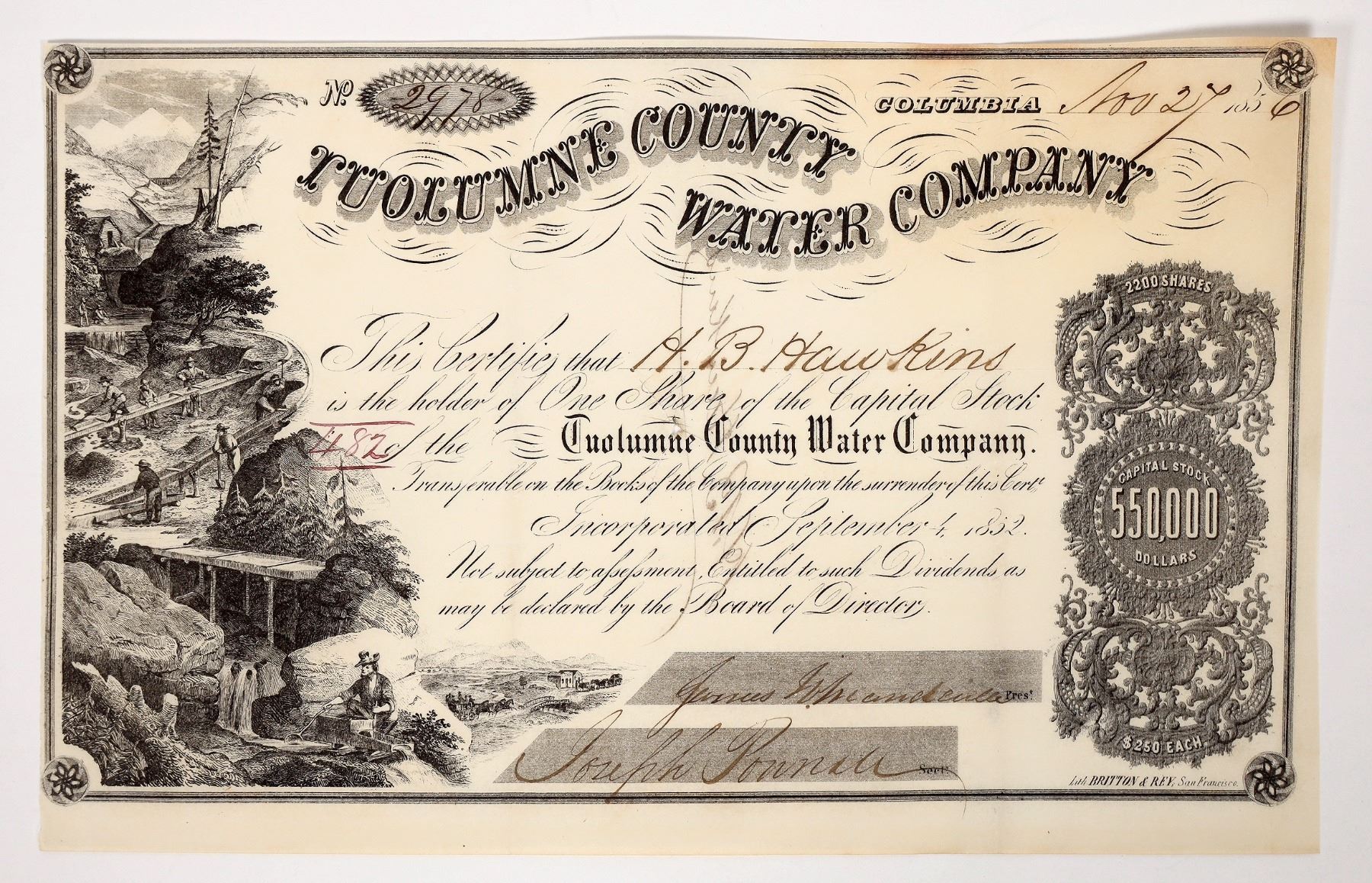 Issued to H B Hawkins, Tuolumne Water Company stock. Namesake of Hawkins Bar, on of the largest bars on Tuolumne River. 1860 shows him working in the shipping industry. Small center hole.