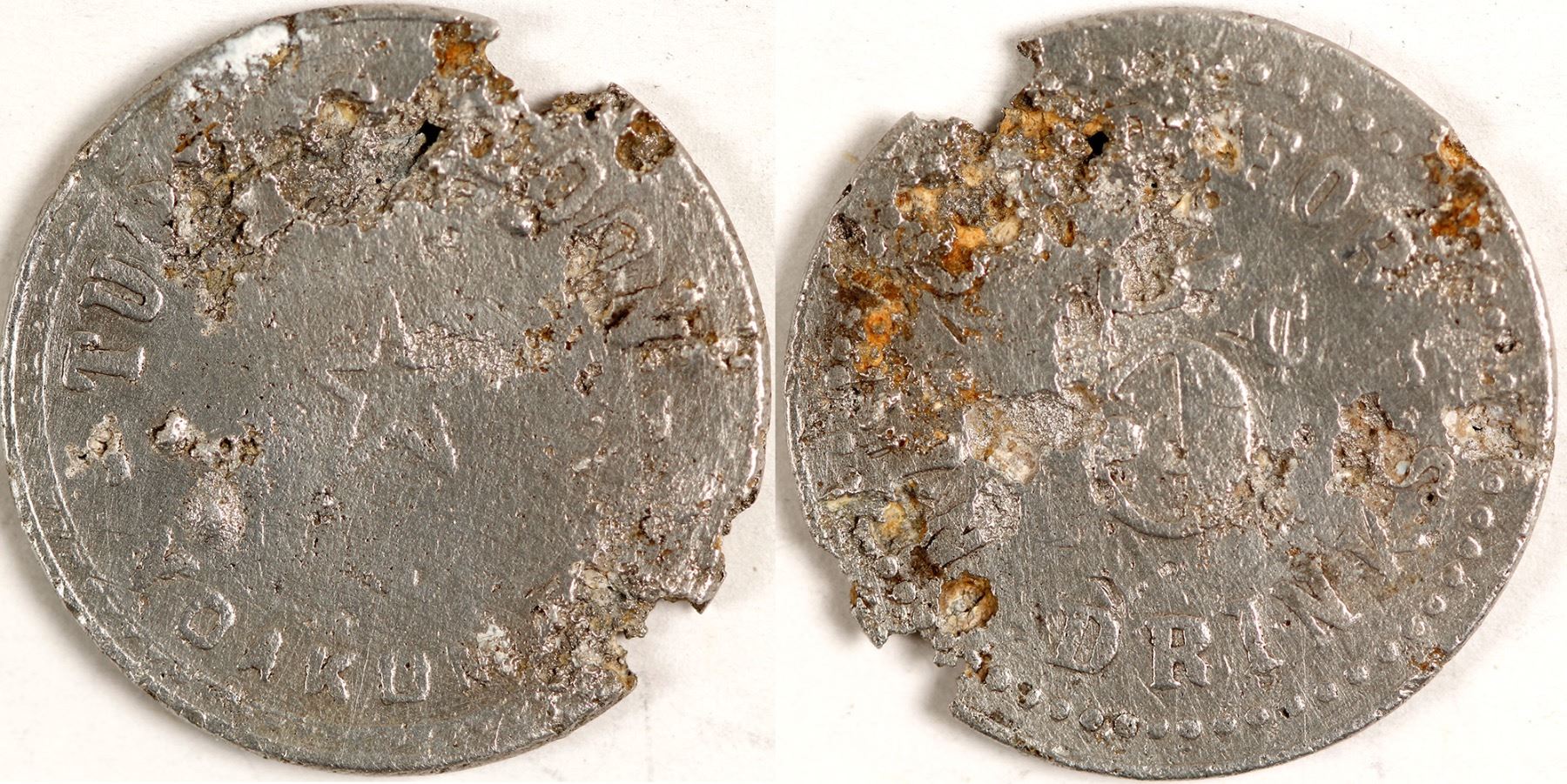 Round aluminum 25mm. TURF SALOON/ (STAR) / YOAKUM T? // GF / 5C /DRINKS. Unlisted token. Note condition issues. HWAC# 62372 Date: Location: Yoakum, Texas