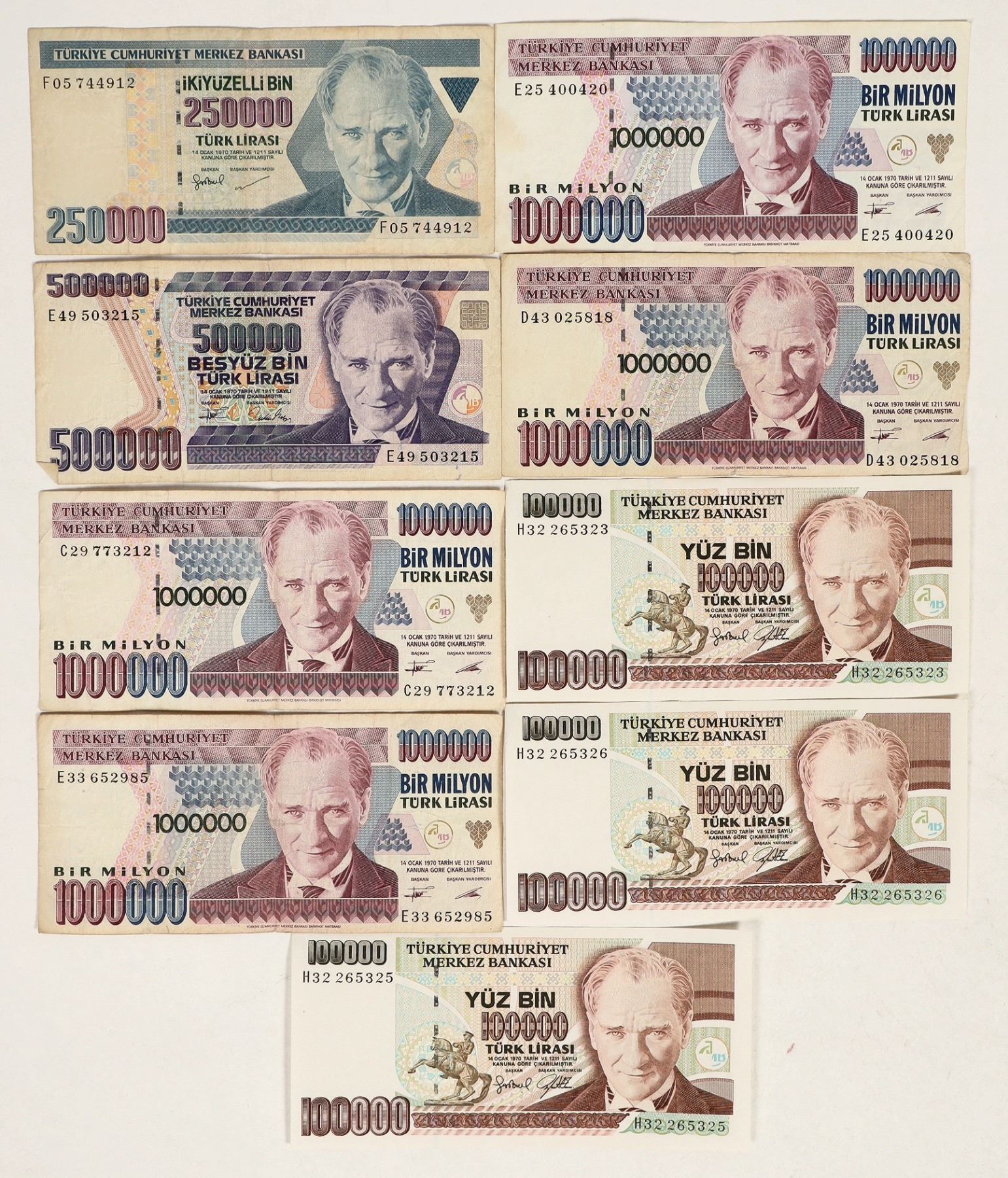 Eight bank notes from Turkey: 100,000 Lira (3); 250,000 lira; 500,000 lira; one billion lira (3).