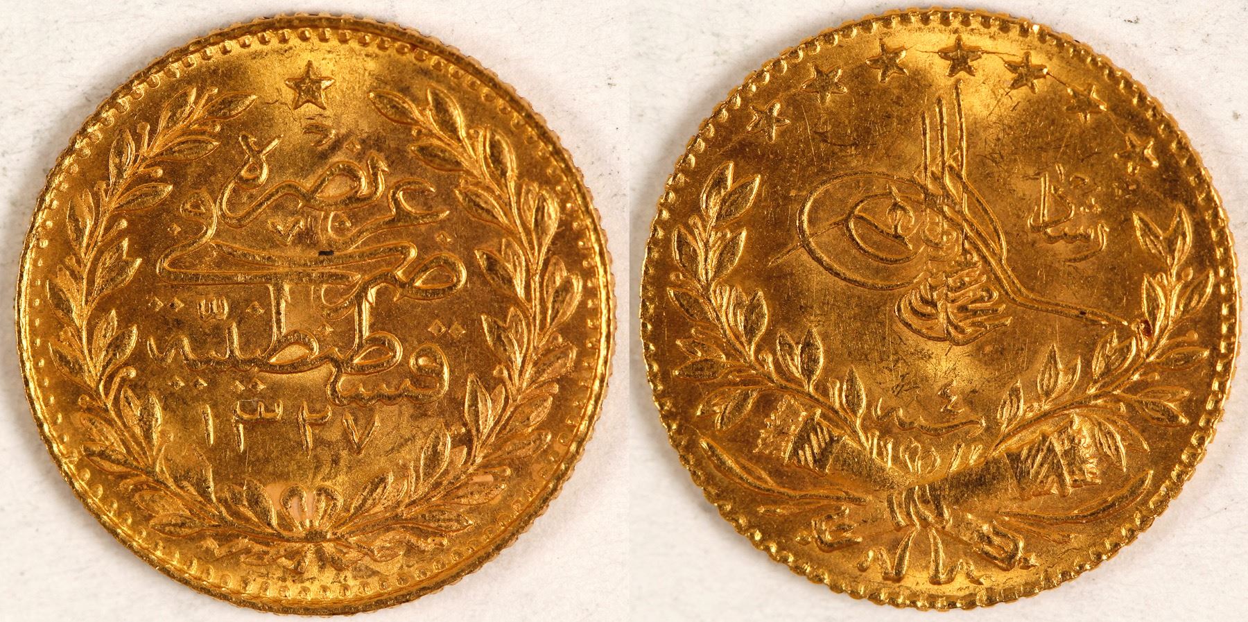 XF. Turkish 25 Kurush. Date is AH1327/4. Obverse has Toughra; "Reshat". Reverse has inscription and date within wreath, star on top. 0.917 Gold. About .05 Troy ounce. Extra Fine. Date: Location: Turkey HWAC# 74056