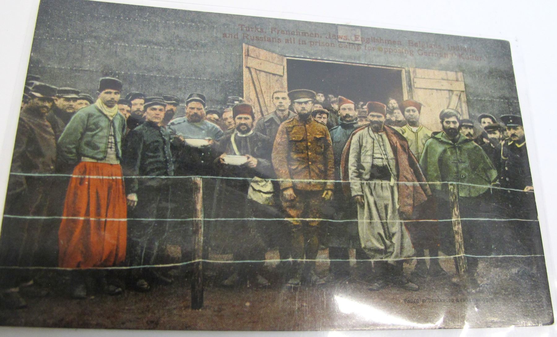cWorld War I. Prisoners are Turks, Frenchmen, Jews, Englishmen, Belgian, Indians, and Russians. All are in the prison camp fro opposing German Kultur! Unique!