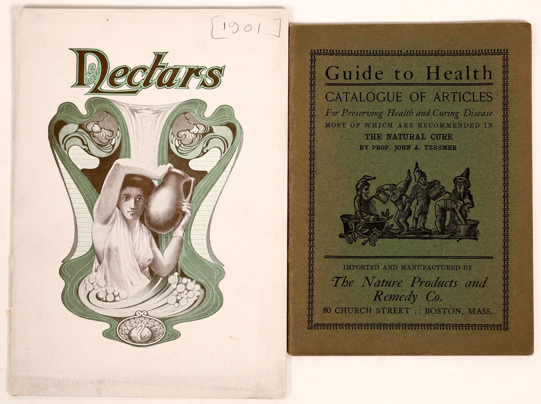 Lot of 2. 1."Nectars" published by Londonderry Lithhios Waters Co of N.H. 1901. Talks about the abilities of their spring water. 2. "Guide To Health" published by The Nature Products and Remedy Co. Boston. Articles on different herbs that provide "the natural cure". Both small pamphlets in very good condition. 1901-08
