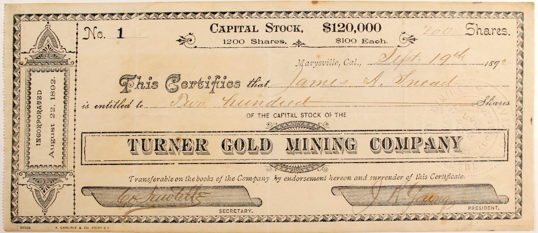 Two hundred shares of capital stock Turner Gold Mining Company, no 1 issued to James A. Snead on September 19, 1892, signed J. R. Young, president. Printer: A. Carlisle & Co., Ken Prag Collection. State: City: Date: HWAC# 81845