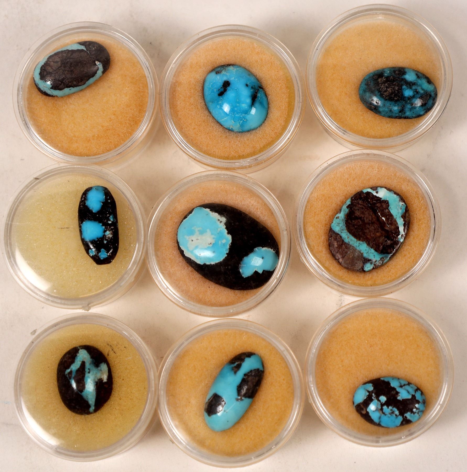 Nine polished, oval cabochons made of deep blue turquoise in a contrasting dark matrix of unknown origin. Largest is approx. 22 x 17 mm and weighs 19.48 carats; Total carat weight is 65 carats for all nine pieces. Ready for setting in rings, brooches, or pendants.