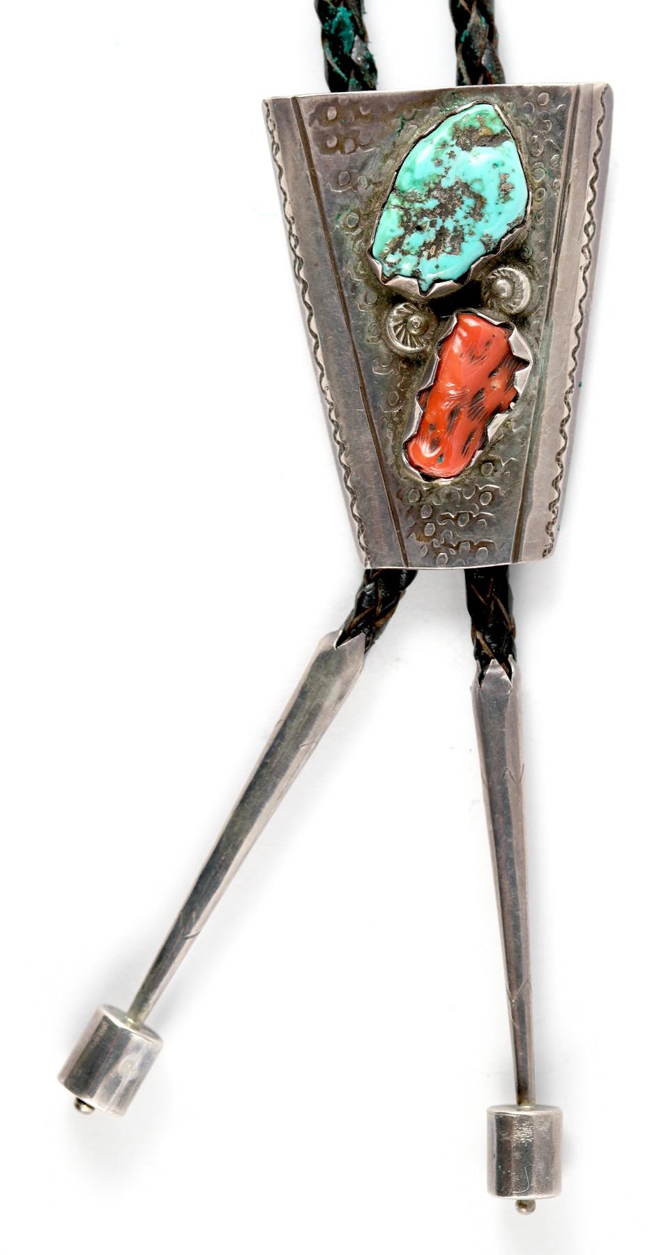 Natural turquoise stone and branch coral set in silver. Hand etched silver, probably by Mike Simplicio. 2" x 1.5". Black leather tie, nice silver tips.