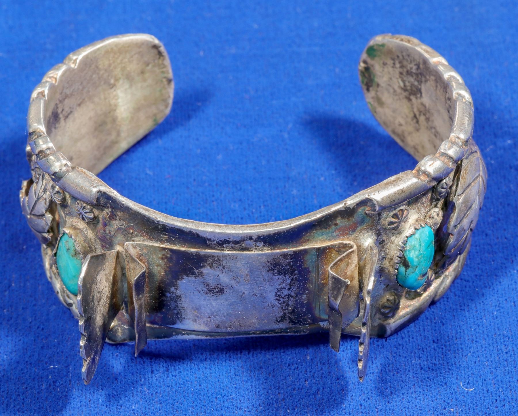 Sterling silver watch bracelet set with two turquoise and two coral stones. Leaf design, probable old pawn, unsigned. Inside measure is 6.25 inches with 1.25-inch gap. Weight is 90.1g.