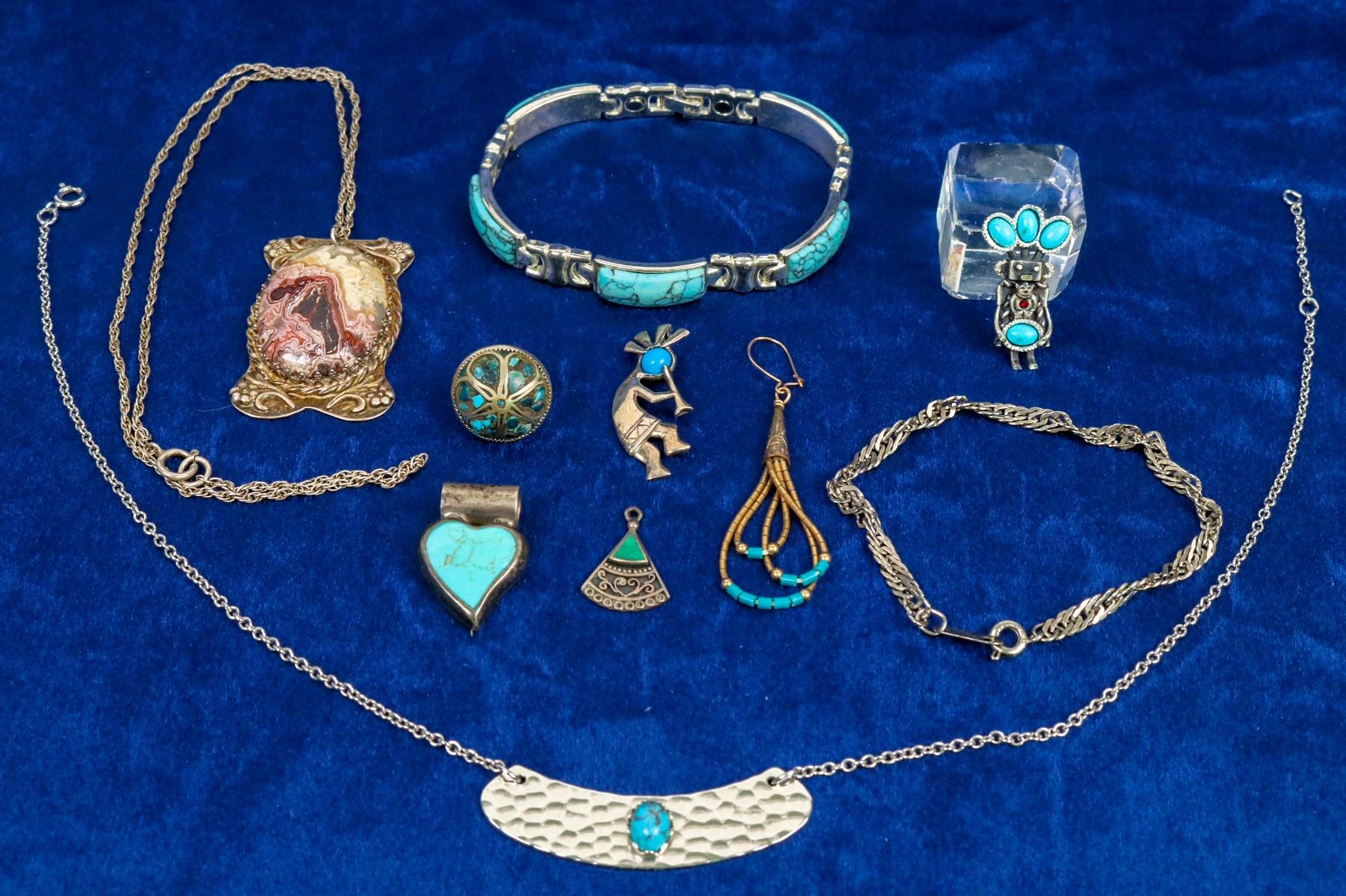 Lot of 10. 1. Two necklace. One w/single turquoise stone. One w/lace agate. 2. Two bracelets : one w/five turquoise bars. One silver bracelet. 3. Six small earrings :post, wire and pierced. One turquoise heart shaped stone, possibly for a necklace. All in very good condition.