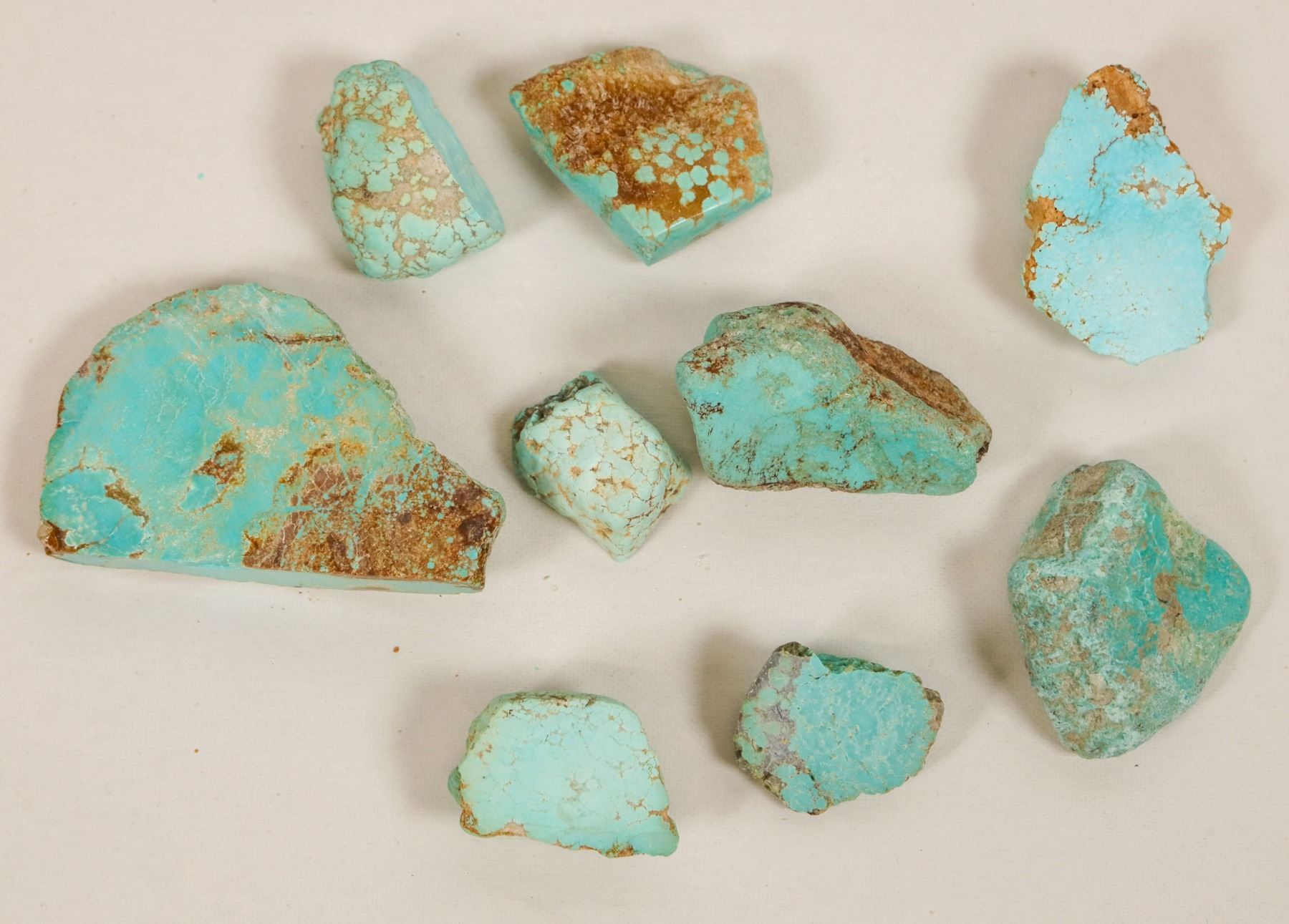 Turquoise (9 pieces) - hand selected, high grade specimens. Blue - some light blue. From No. 8 turquoise mine, located in Nevada, often considered one of the top turquoise mines in the world. Very collectible. Some pieces have one cut and all have a polished surface. The largest piece is about 3" x 1-3/4" x 1/2". Smallest is about 1" x 3/4" x 1/2". Weighs approximately 1 pound. [ Nevada