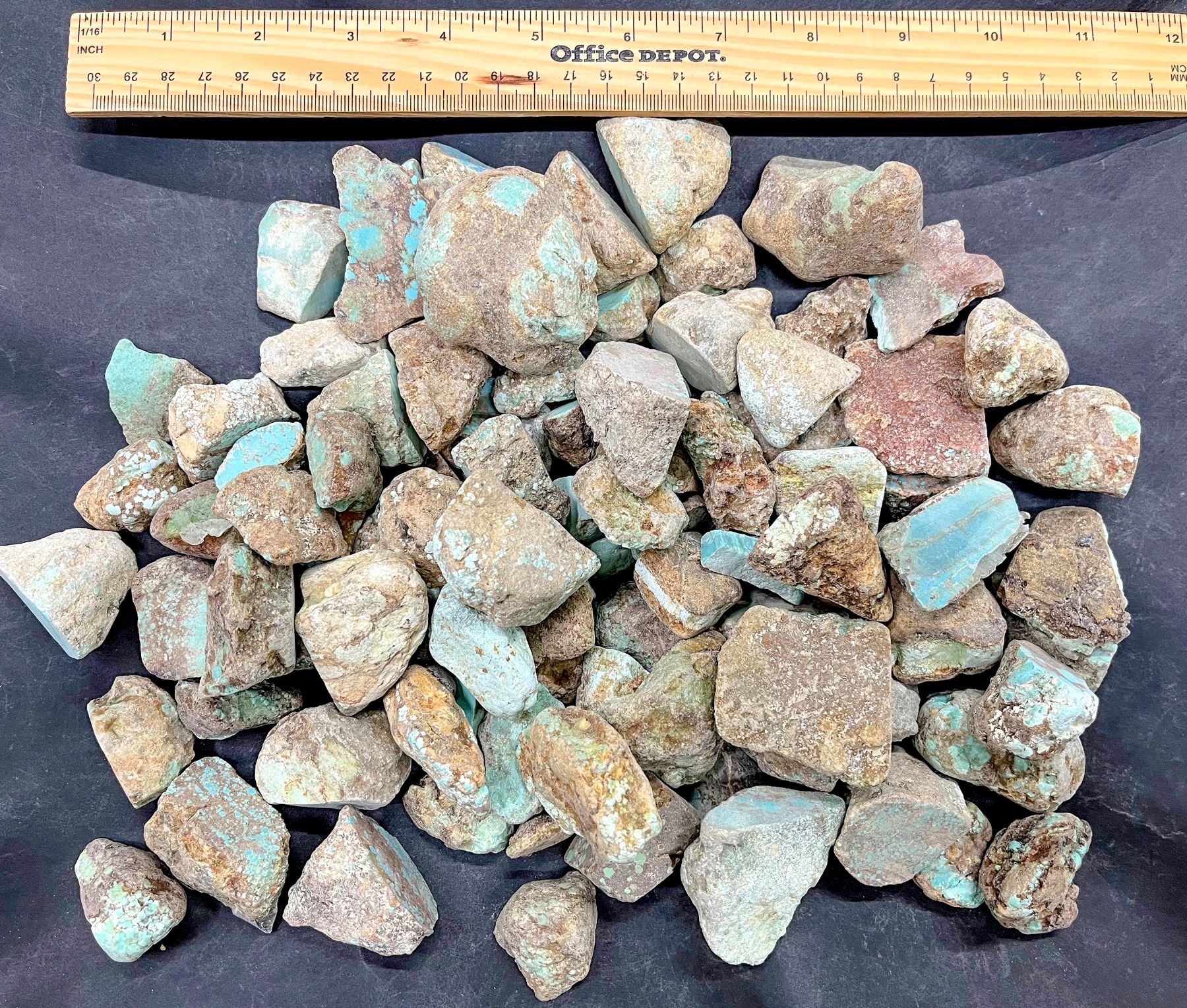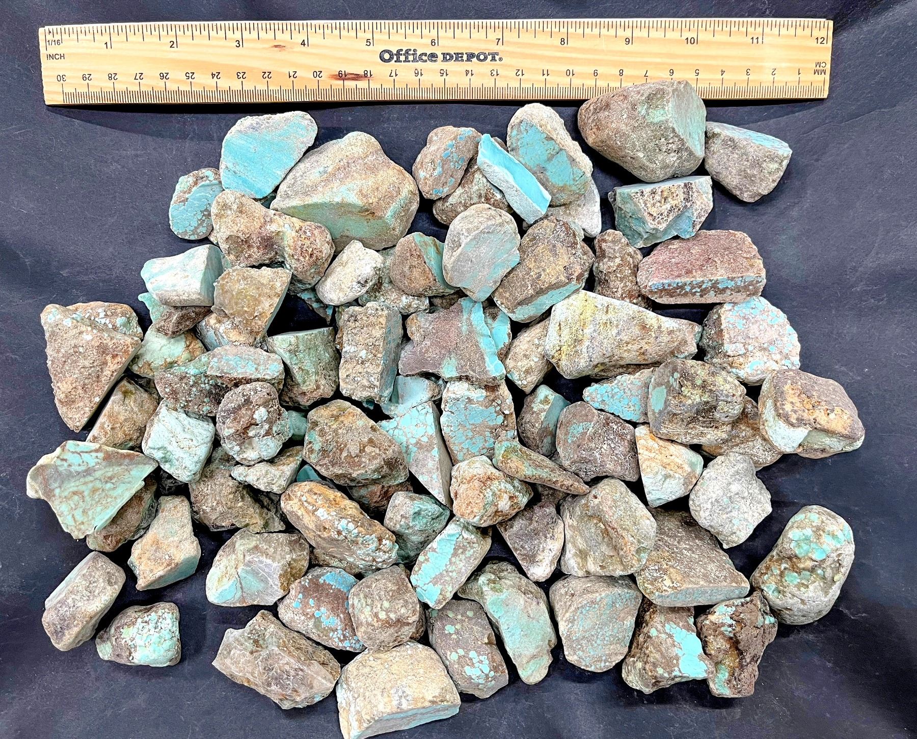 Rough turquoise - small and medium sizes with cut surfaces. Each with one surface cut and polished. Approximate weight 4.6 pounds. From No. 8 turquoise mine, located in Nevada, often considered one of the top turquoise mines in the world. Very collectible. Varying sizes. Largest piece about 2" x 1.5" x 1.5", smallest 1" x .5" x .5".