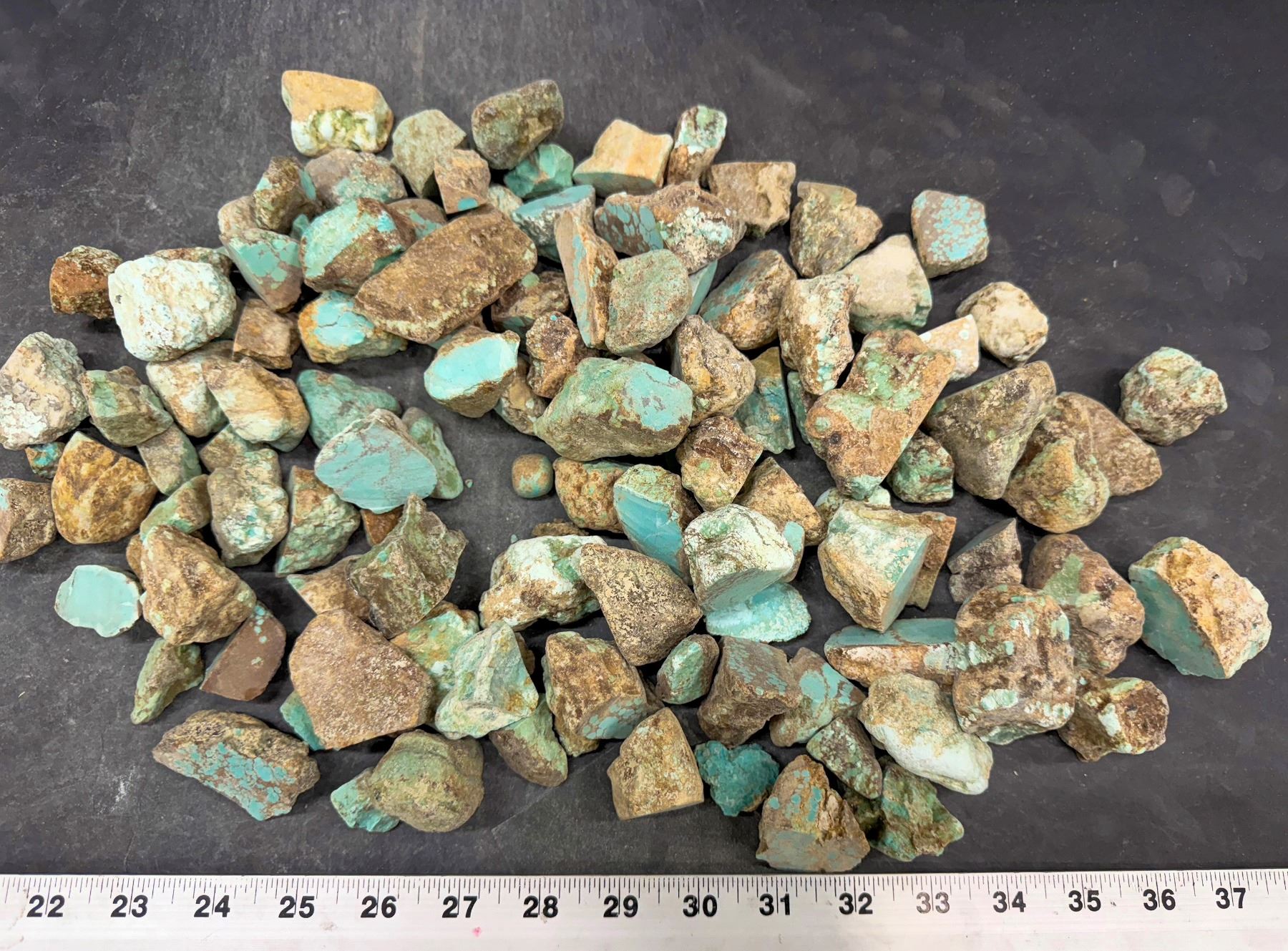 Rough turquoise - cut surfaces. Smaller pieces, each with one surface cut and polished. Medium color. Approximate weight 7 pounds. From No. 8 turquoise mine, located in Nevada, often considered one of the top turquoise mines in the world. Very collectible turquoise ñ can't find this stuff anymore!†Largest piece about 2" x 1" x 1", smallest 1" x .5" x .5".