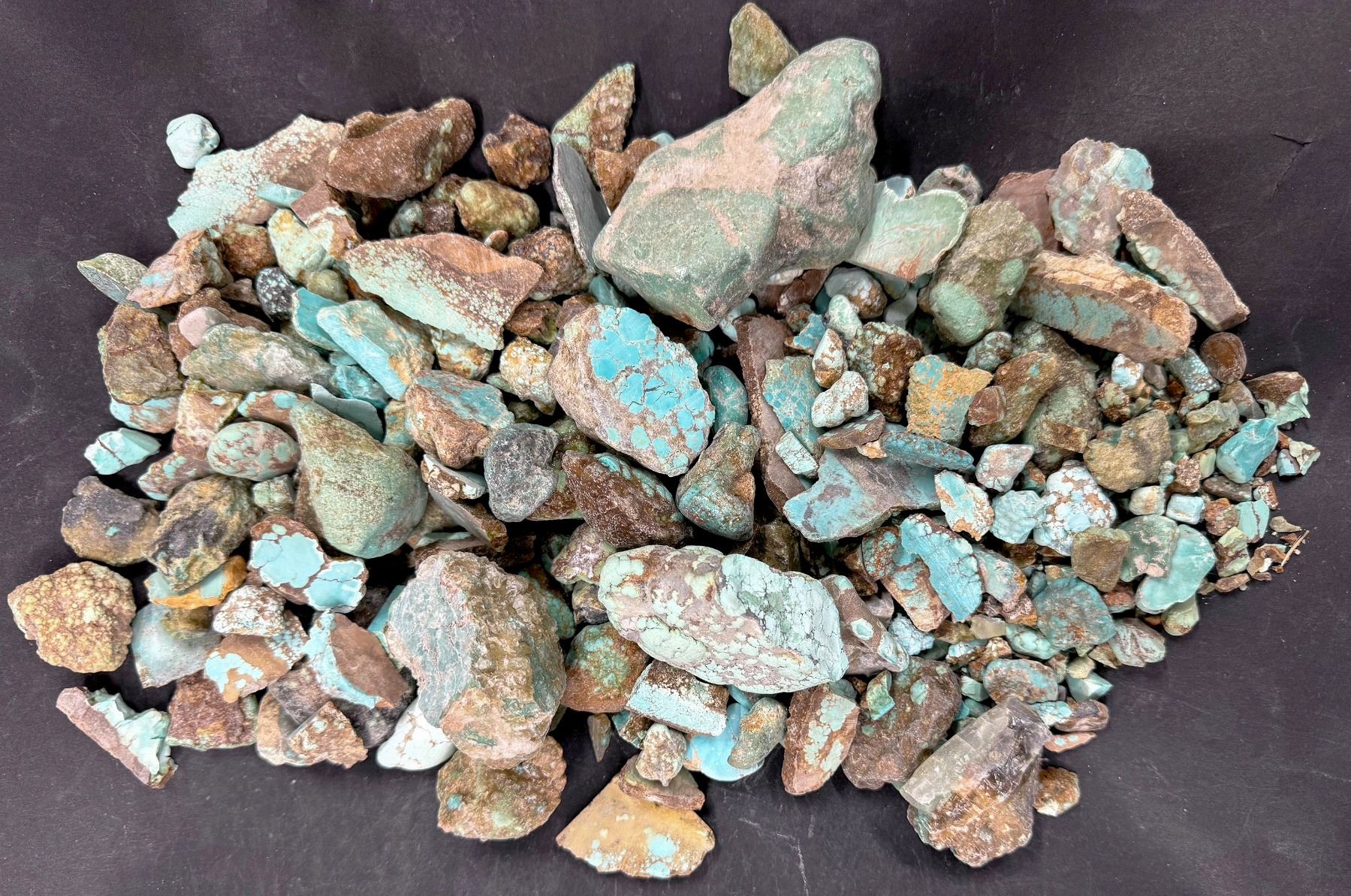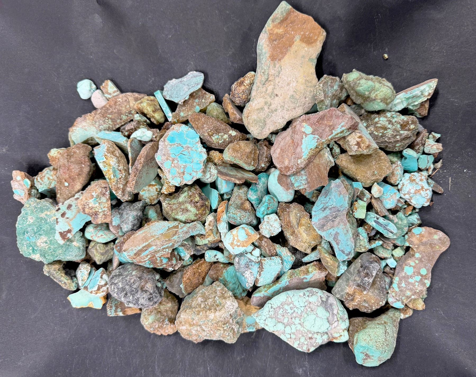 Rough turquoise - grab bag. Approximate weight 5 pounds. From No. 8 turquoise mine, located in Nevada, often considered one of the top turquoise mines in the world. Largest piece about 3.5" x 2" x 1.25". [ Nevada