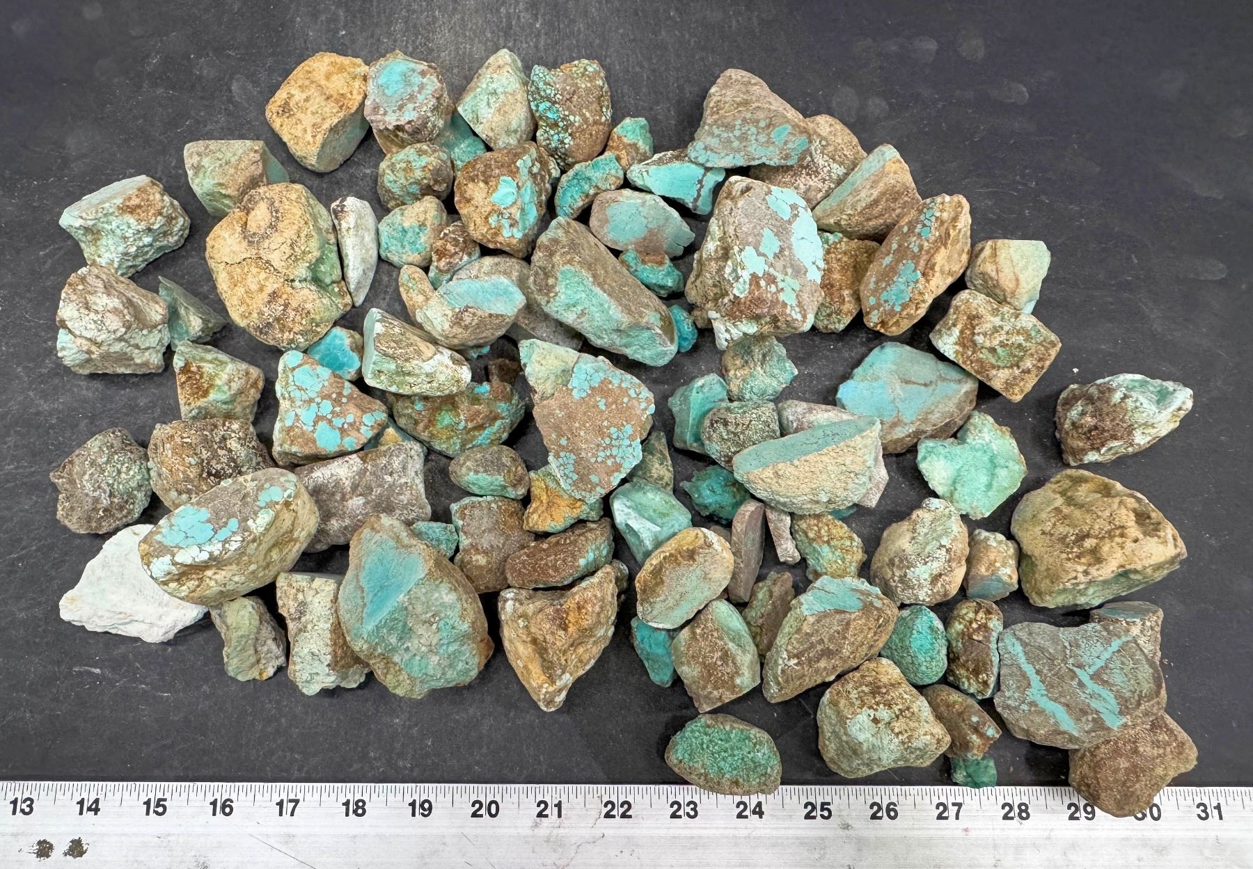 Rough turquoise - hand selected, Grade 1.5 specimens. Good color. Some deep blues and greens. Some cut. Includes spider web. From No. 8 turquoise mine, located in Nevada, often considered one of the top turquoise mines in the world. Very collectible. The largest piece is about 2" X 2" X 1.5", the smallest is 1" x .5" x .5". Approximate weight 8.4 pounds. Nice group.