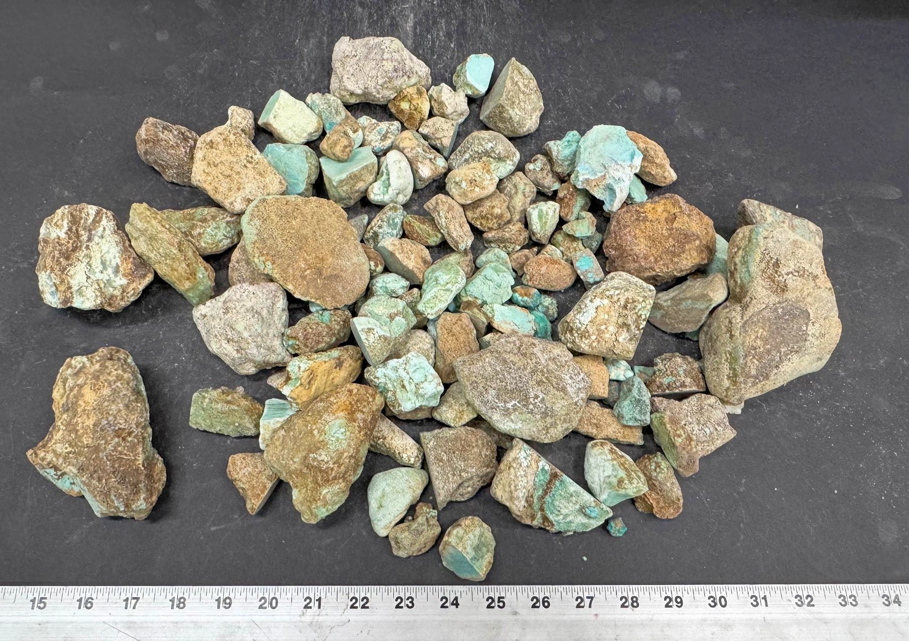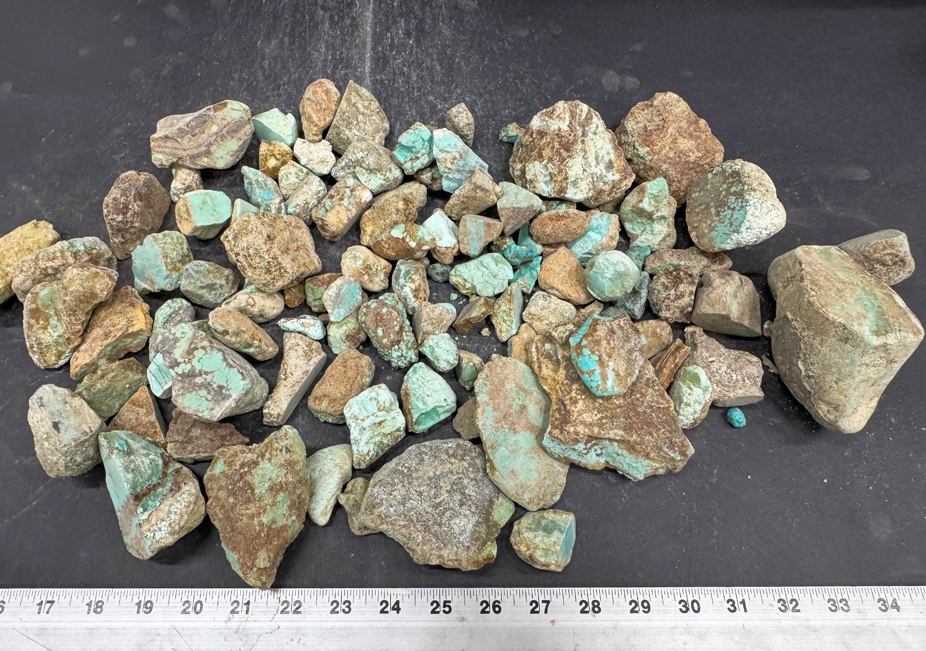 Rough turquoise - Grade 2, some treated. Approximate weight 8.7 pounds. From No. 8 turquoise mine, located in Nevada, often considered one of the top turquoise mines in the world. The mine, in Eureka county, north of Carlin, Nevada, was discovered in 1925 and first mined in 1929. Historically, it produced some of the largest nuggets of turquoise ever discovered, including one over 150 pounds. This is very collectible turquoise ñ as no more can ever be mined! Info: turquoisematrix.com. Largest piece about 4.5" x 3" x 2", smallest about 1" x 1" x 1".