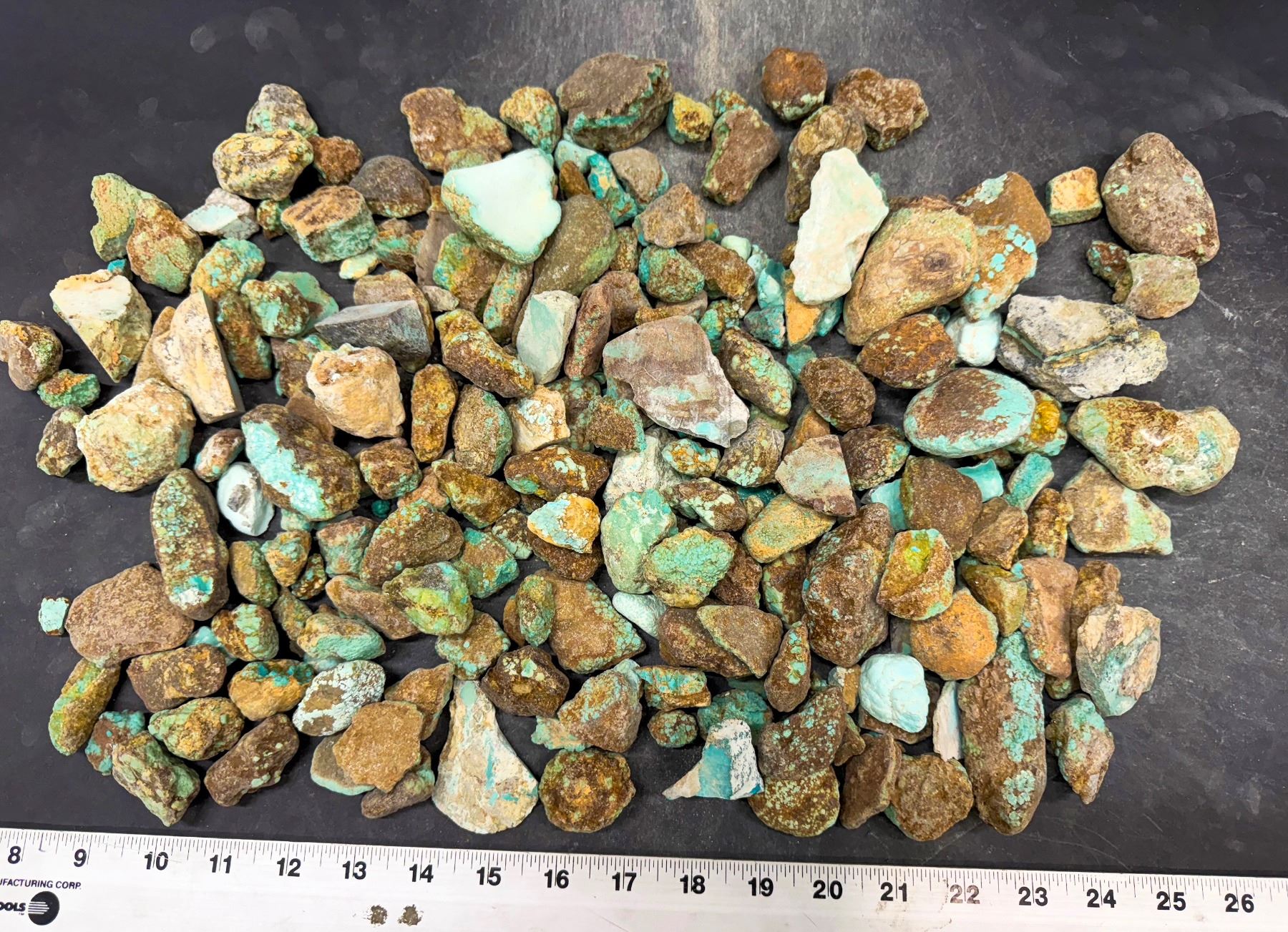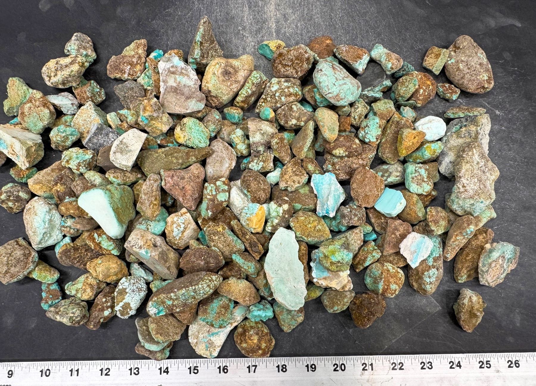 Rough turquoise - Grade 2.5. Decent color. Some treated. Some spider web. Approximate weight 8.4 pounds. Largest piece about 2.5" x 1.5" x 1", smallest about .5" diameter. From No. 8 turquoise mine, located in Eureka county, north of Carlin, Nevada. The first claim on the Number 8 mine was filed in 1929. Afterwards, several famous turquoise miners owned the mine in the ensuing years. The premier spider web turquoise ever discovered was found by the mining brothers, T.G. and J. W. Edgars, while mining for copper. Number 8 is also the mine that produced a selection of the biggest nuggets ever found in history. It closed in 1976, making pieces from No. 8 highly valuable.