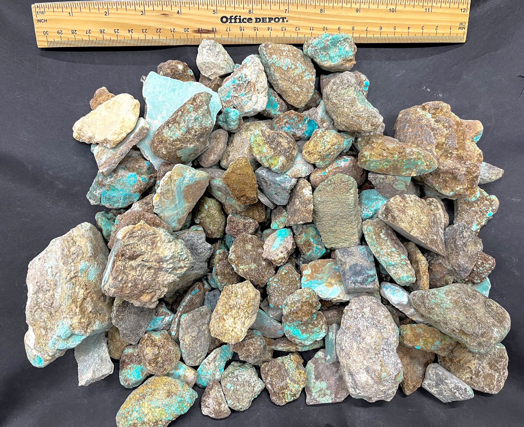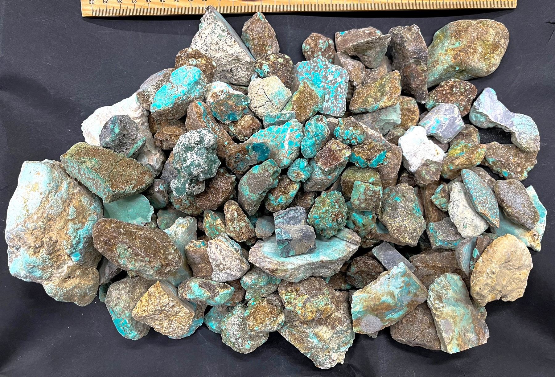 Rough turquoise - Grade 2.5, fair color, some treated, some spider web, a few cut. Approximate weight 6.8 pounds. From No. 8 turquoise mine, located in Nevada, often considered one of the top turquoise mines in the world. The mine, in Eureka county, north of Carlin, Nevada, was discovered in 1925 and first mined in 1929. The turquoise from this mine is unique and easy to spot. It is mostly composed of a matrix of spider web type with varieties of black to gold brown and color grades of extremely dark blue to light blue, sometimes green. It closed in 1976, making the turquoise mined there highly collectible. Largest piece about 4" x 2" x 1", smallest about .5" x .5" x .25".