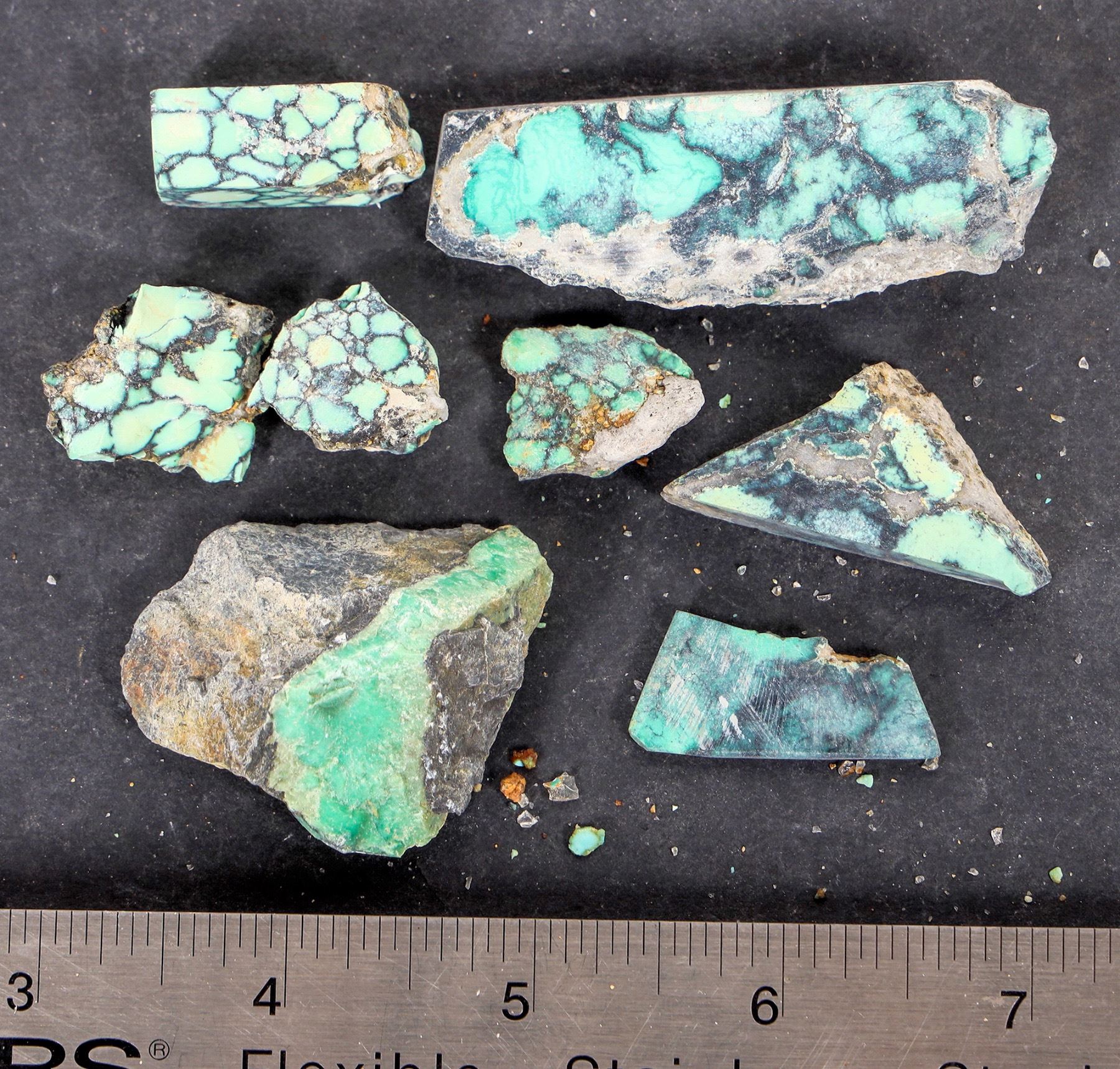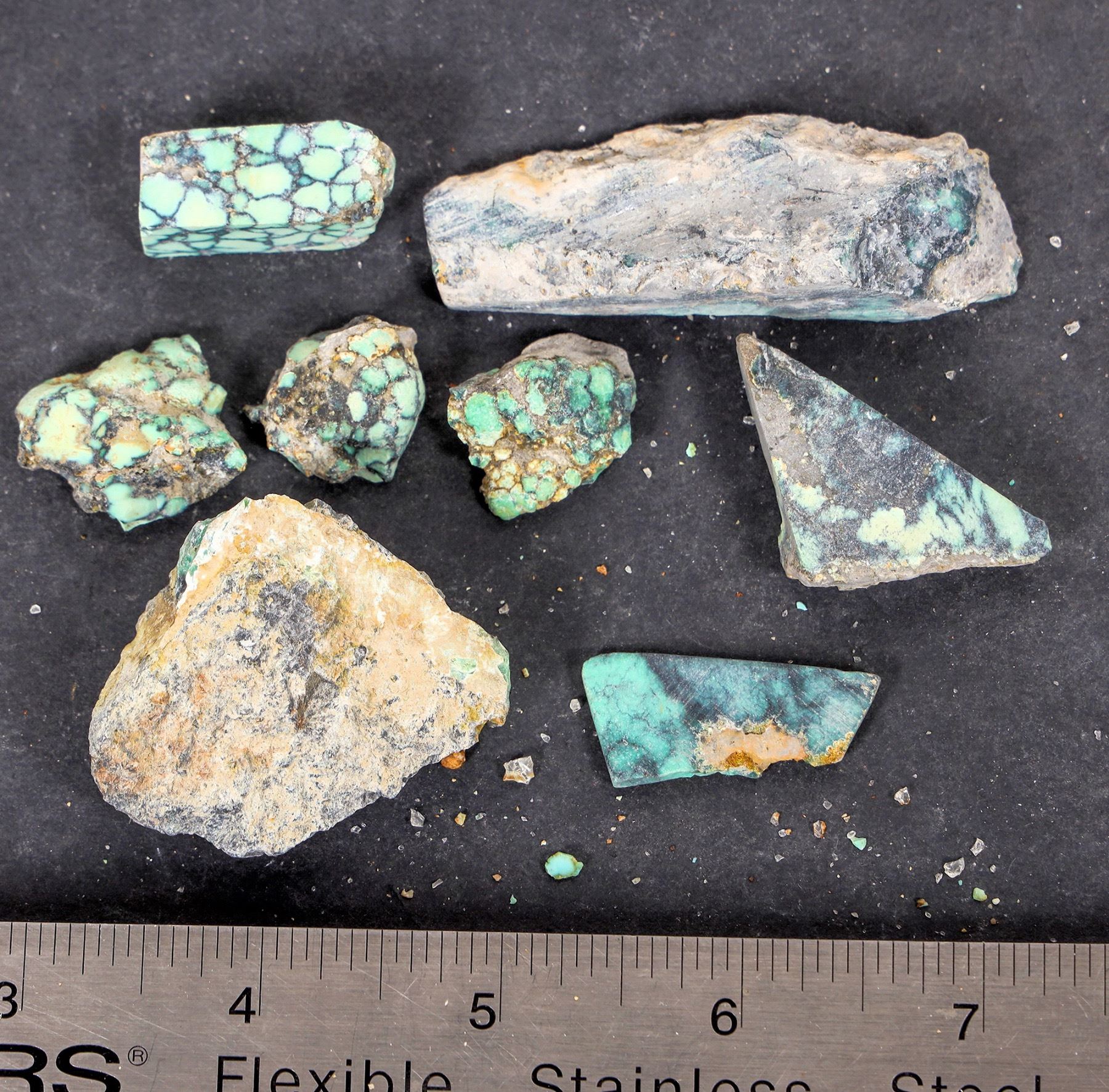 Rough turquoise - 7 pieces of Rare Green Spider Web variety. Some small slabs, some surface cut, one raw piece with band of green. Largest piece about 2-3/4" x 1" x 1/2", smallest 3/8" x 3/8" x 1/4". Approximate weight 3.35 ounces. From No. 8 turquoise mine, located in Eureka county, north of Carlin, Nevada. The historic deposit, first discovered in 1925 and mined in 1929, is famous for producing turquoise with a spider web type matrix in varieties of black to gold brown and colors from dark to light blue, and occasionally green tinted. Very collectible. The mine closed in 1976. You can't find this stuff anymore!
