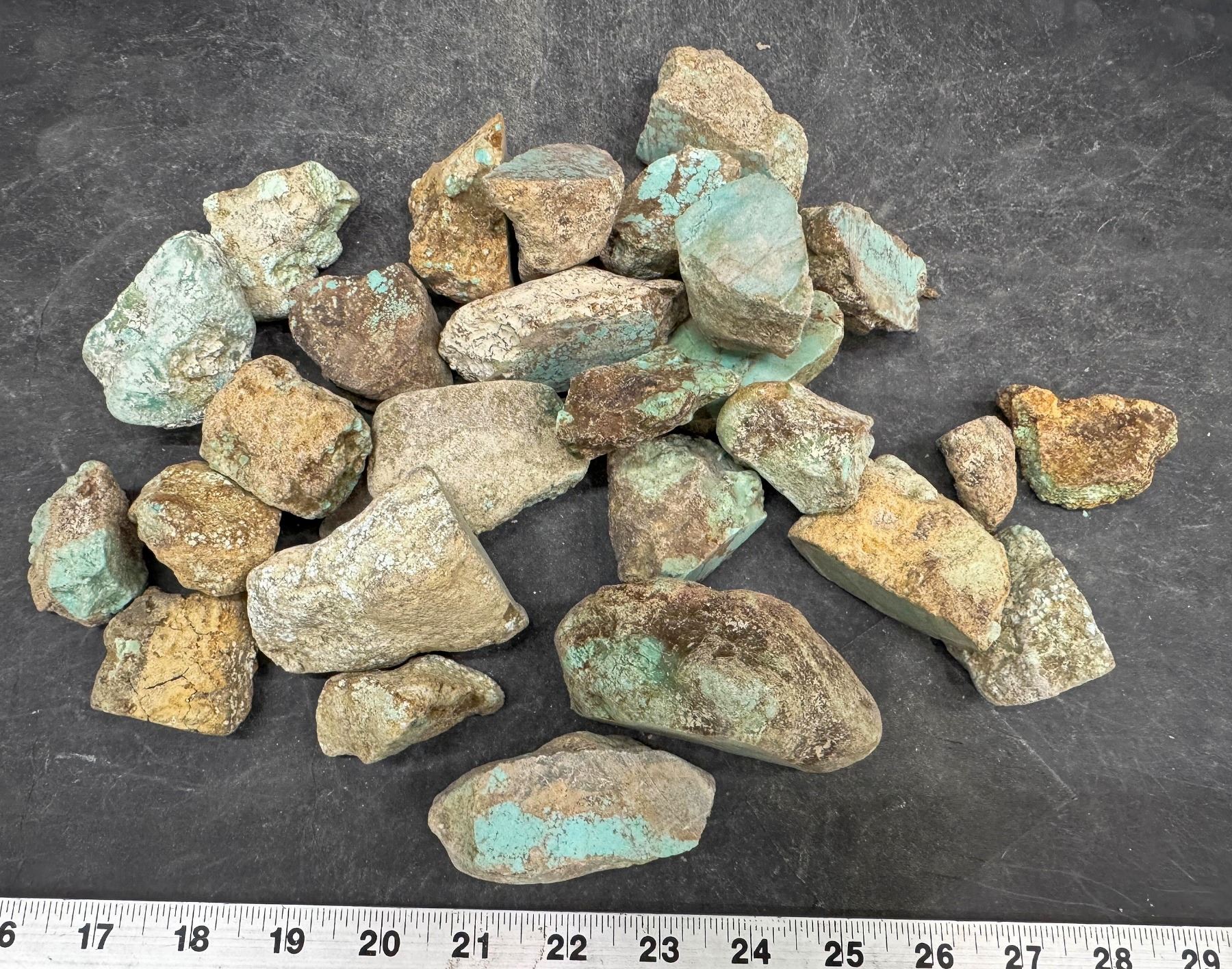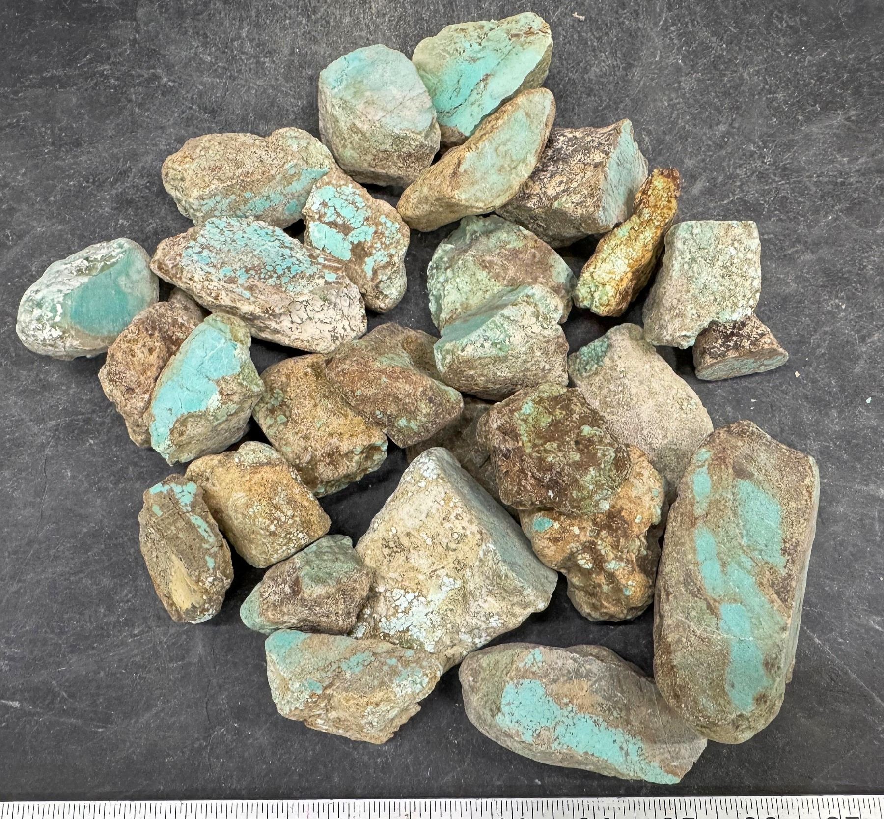 Rough turquoise - cut surfaces, large pieces. Approximate weight 4.8 pounds. From No. 8 turquoise mine, located in Nevada, often considered one of the top turquoise mines in the world. Very collectible. Largest piece about 3.75" x 2" x 1.5", smallest 2" x 1" x 1". Nice pieces.
