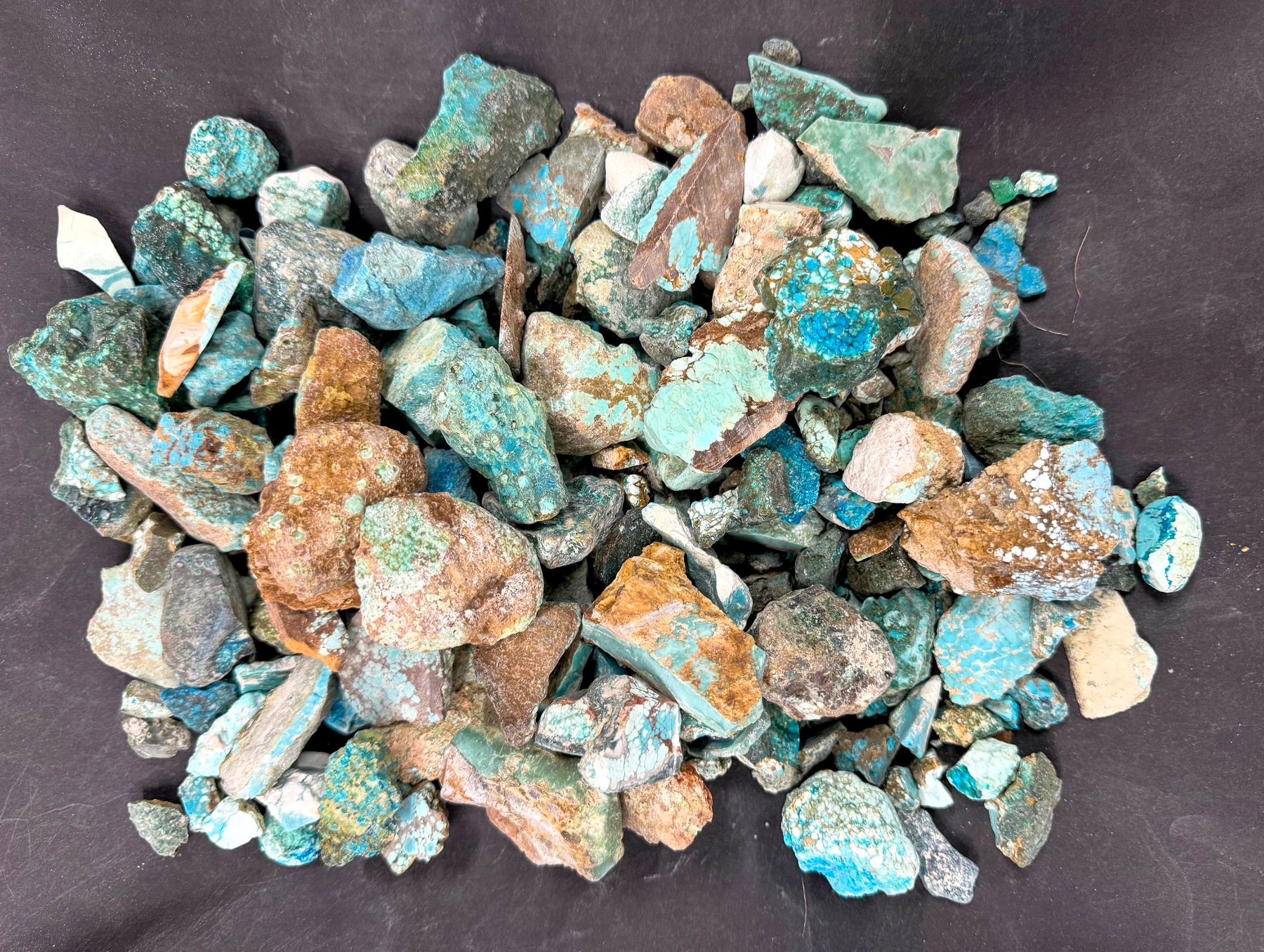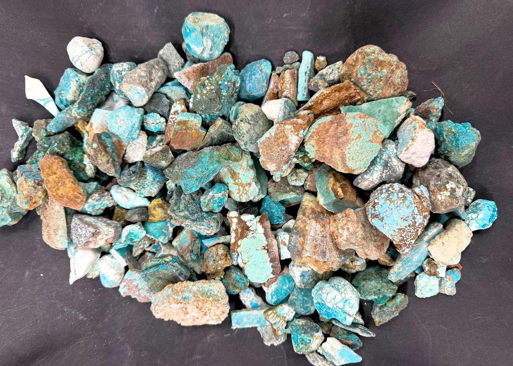Rough turquoise - medium, some treated, some not. All sizes. Some cut. Approximate weight 3.8 pounds. From No. 8 turquoise mine, located in Nevada, often considered one of the top turquoise mines in the world. Very collectible. Largest piece about 2" x 1" x .5". [ Nevada