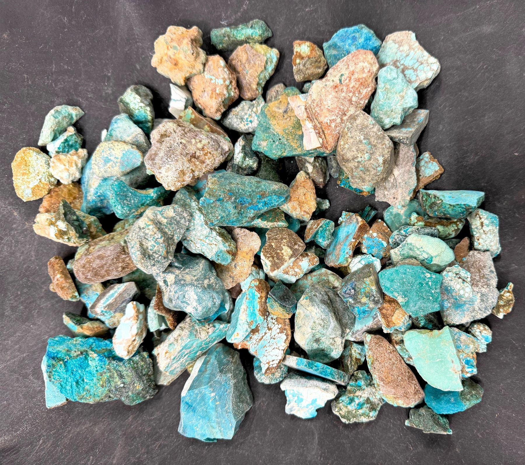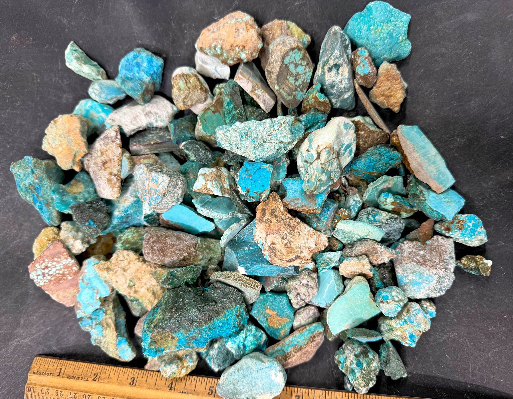 Rough turquoise - medium grade but, some treated, some not. All sizes. Some cut. Approximate weight 4 pounds. From No. 8 turquoise mine, located in Nevada, often considered one of the top turquoise mines in the world. Very collectible. Largest piece about 2.5" x 2" x .5". [ Nevada