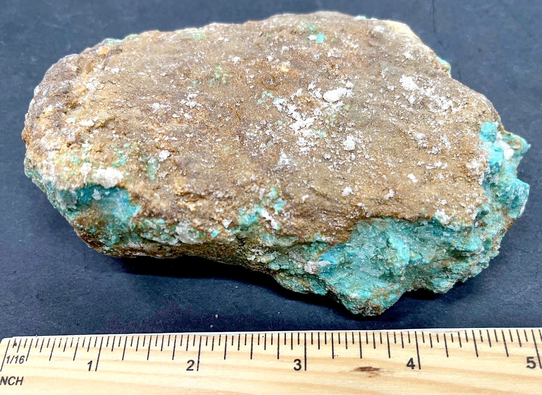 Rough turquoise - Raw Vein, treated. Approximate weight 1.6 pounds. Measures about 5.5" x 3.5" x 1.5". From No. 8 turquoise mine, located in Nevada, often considered one of the top turquoise mines in the world. The mine, in Eureka County, north of Carlin, Nevada, was first mined in 1929. Historically, it produced some of the largest nuggets of turquoise ever discovered, including one over 150 pounds! Turquoise mining at No. 8 mine ceased in 1976. Highly collectible.