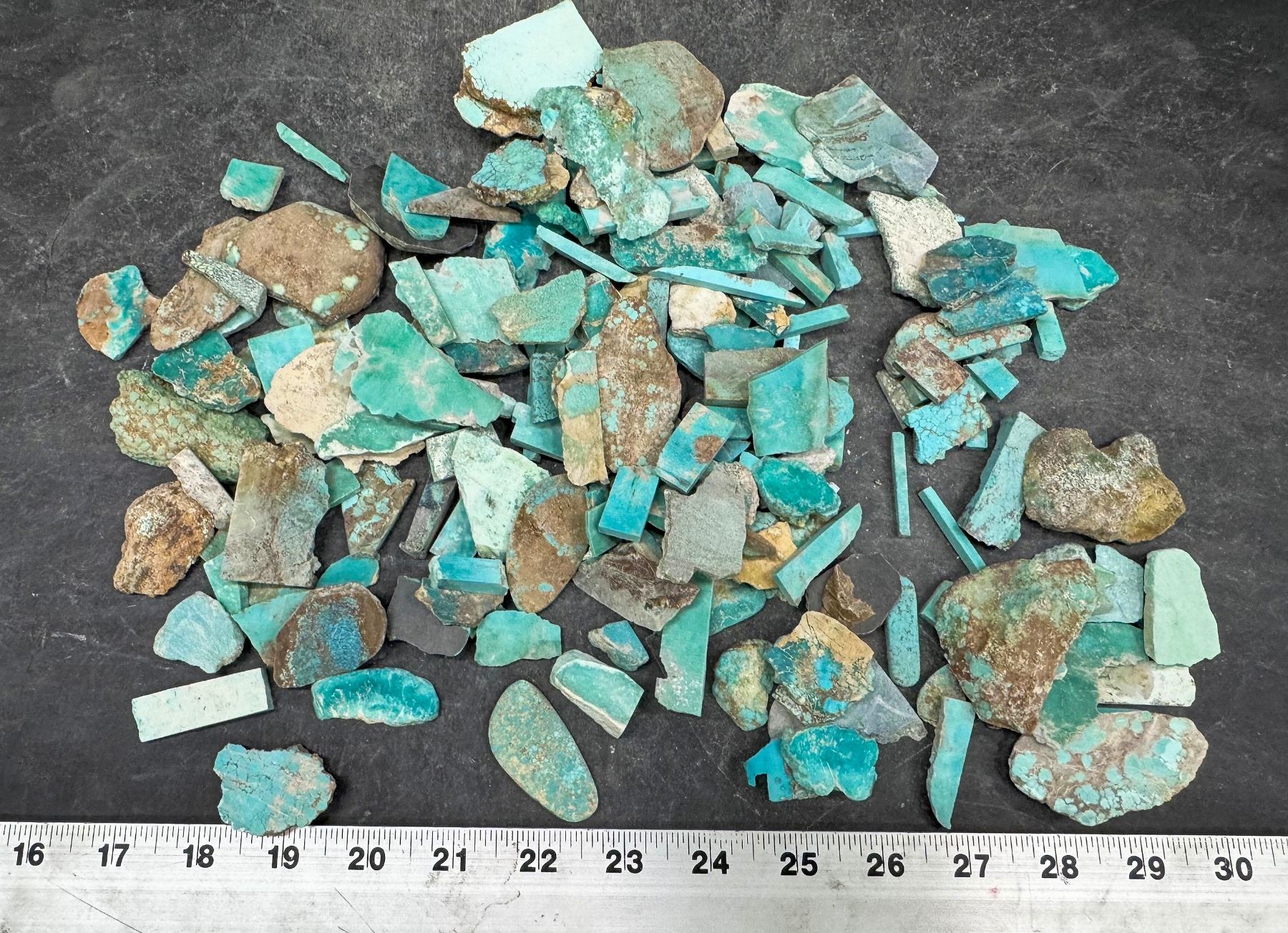 Rough turquoise - slabs, small and medium size. Approximate weight 2.2 pounds. From No. 8 turquoise mine, located in Nevada, often considered one of the top turquoise mines in the world. Very collectible. Largest piece about 2.5" x 1.5" x 1". Nice pieces.