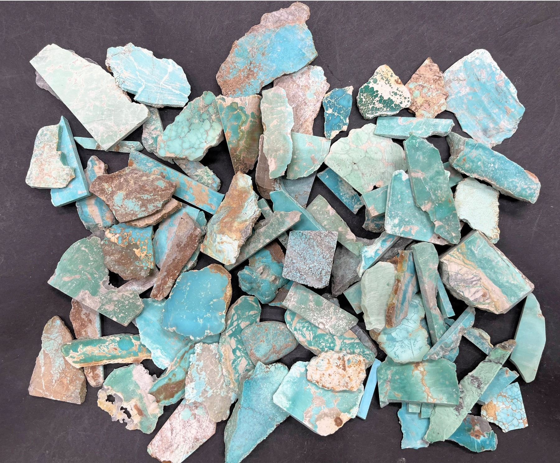 Rough turquoise - small and medium sized slabs. Largest piece about 2" x 1.5" x .25". Approximate weight 1.6 pounds. Nice color. From No. 8 turquoise mine, located in Nevada, often considered one of the top turquoise mines in the world. Very collectible turquoise “ can't find this stuff anymore!