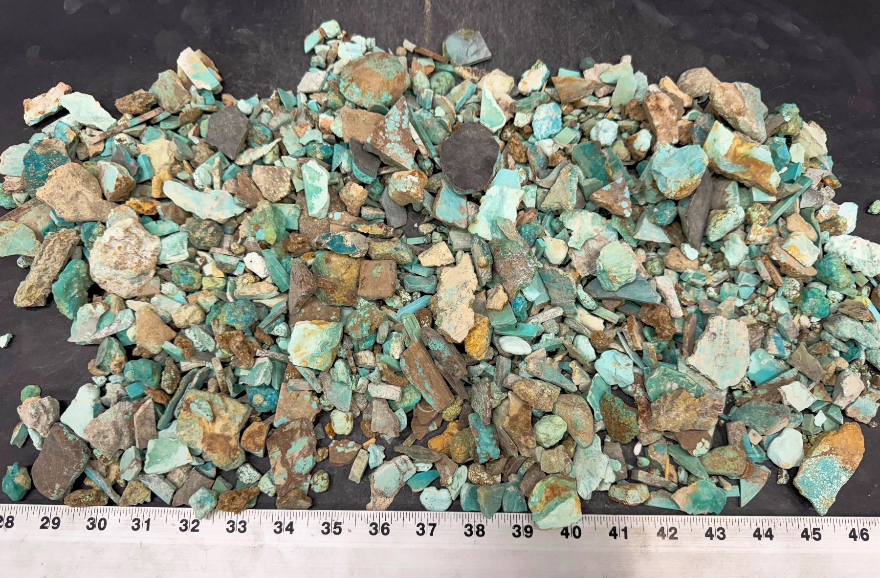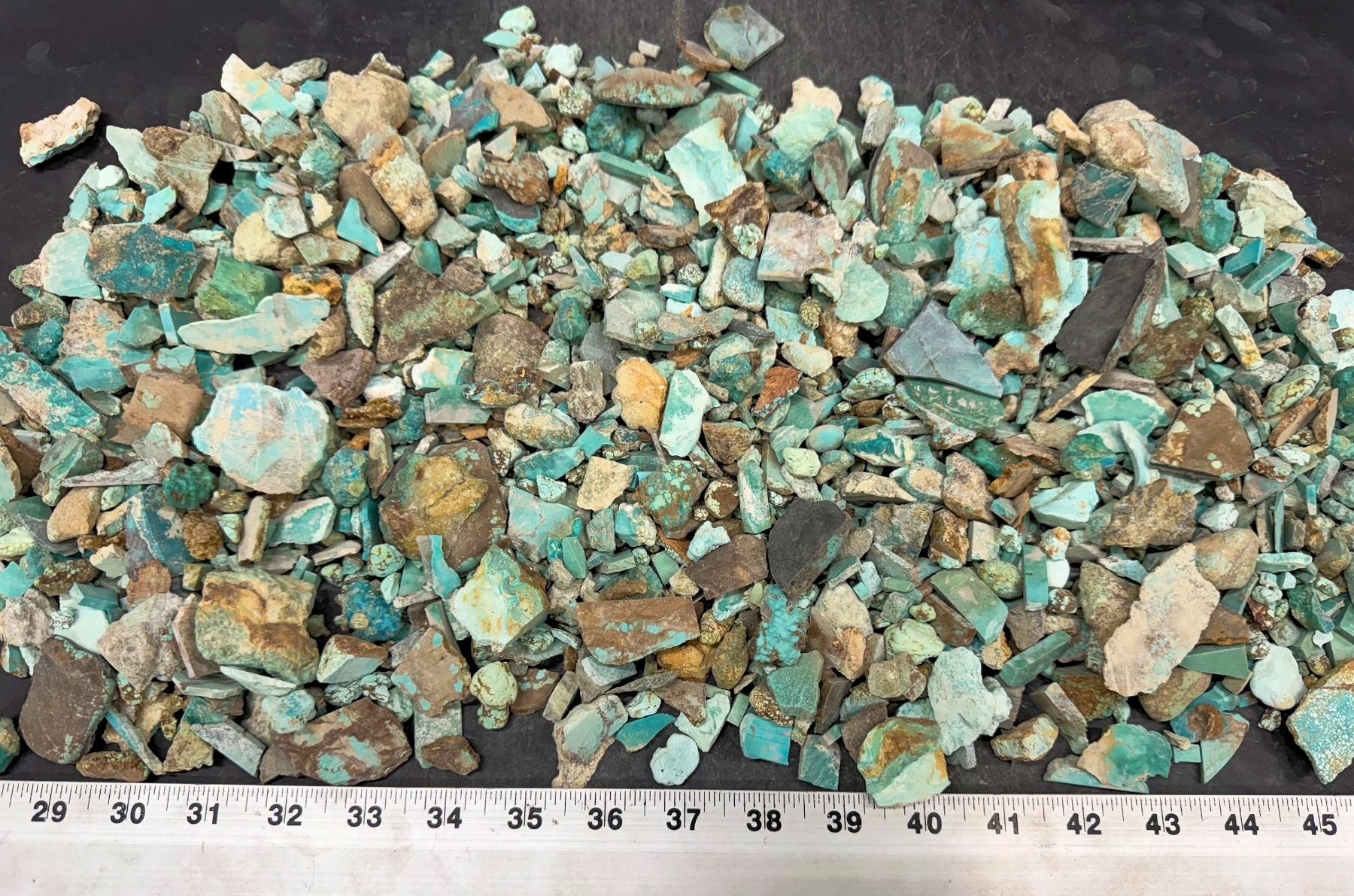 Rough turquoise - smalls. Cut, etc. Good for tumbling. Approximate weight 5.4 pounds. From No. 8 turquoise mine, located in Eureka county, north of Carlin, Nevada. The historic deposit was discovered in 1925 and first mined in 1929. It produced some of the largest nuggets of turquoise ever discovered, including one over 150 pounds. Very collectible turquoise ñ can't find this stuff anymore!†Largest piece about 1.5" x 1" x 1", but mostly smaller.