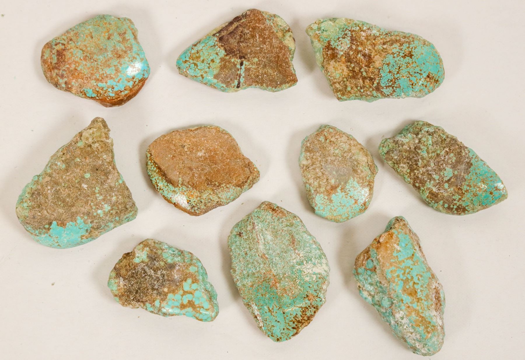 Turquoise (10 pieces) - hand selected, high grade specimens. Spider web. Blue-green. From No. 8 turquoise mine, located in Nevada, often considered one of the top turquoise mines in the world. Very collectible. All pieces have one polished surface. The largest piece is about 2-1/4" x 1-3/4" x 3/4". Smallest is about 1-3/4" x 1-1/4" x 1/4". Approximate weight 1 pound. [ Nevada