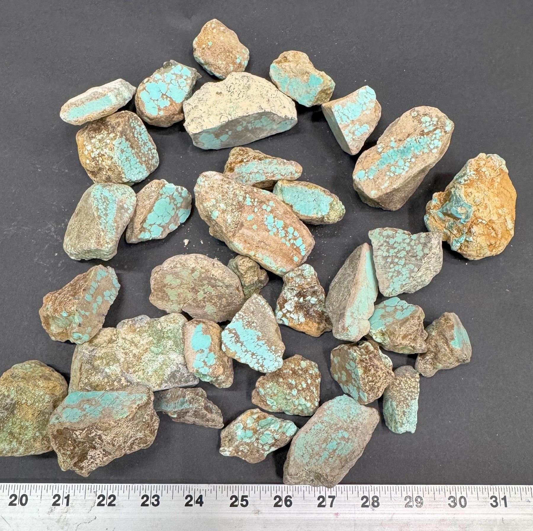 Rough turquoise - Spider Web, most with one cut surface to show off the color and patterns. Approximate weight 4.8 pounds. From No. 8 turquoise mine, located in Nevada, often considered one of the top turquoise mines in the world. Very collectible. Largest piece about 3" x 2" x 1", smallest about 1" x 1" x 1". Nice pieces.
