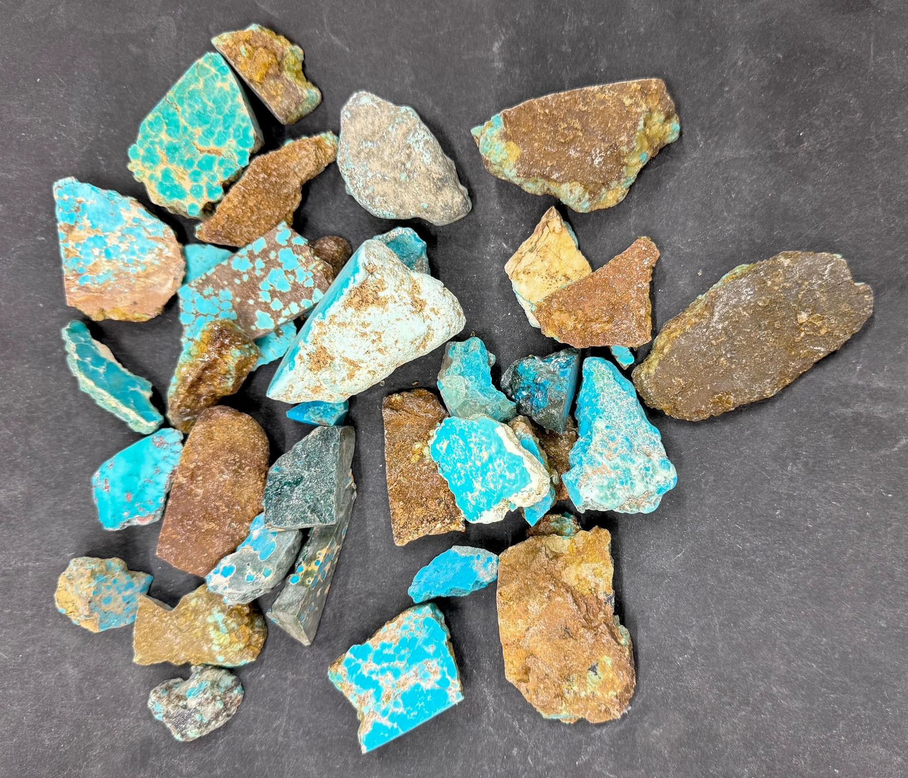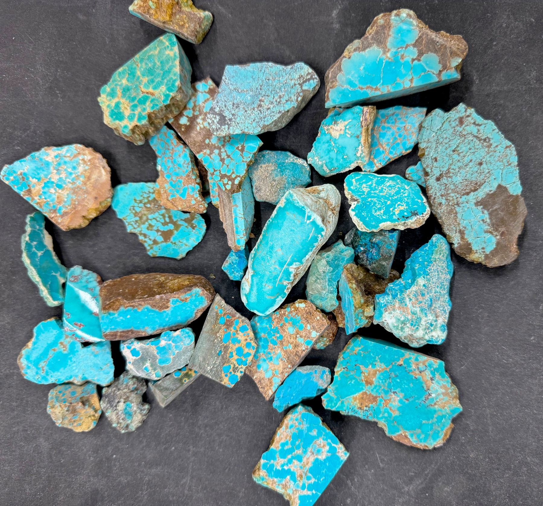 Rough turquoise - stabilized, good color. Approximate weight 1.6 pounds. From No. 8 turquoise mine, located in Nevada, often considered one of the top turquoise mines in the world. Largest piece about 2.75" x 1.25" x .25." [ Nevada