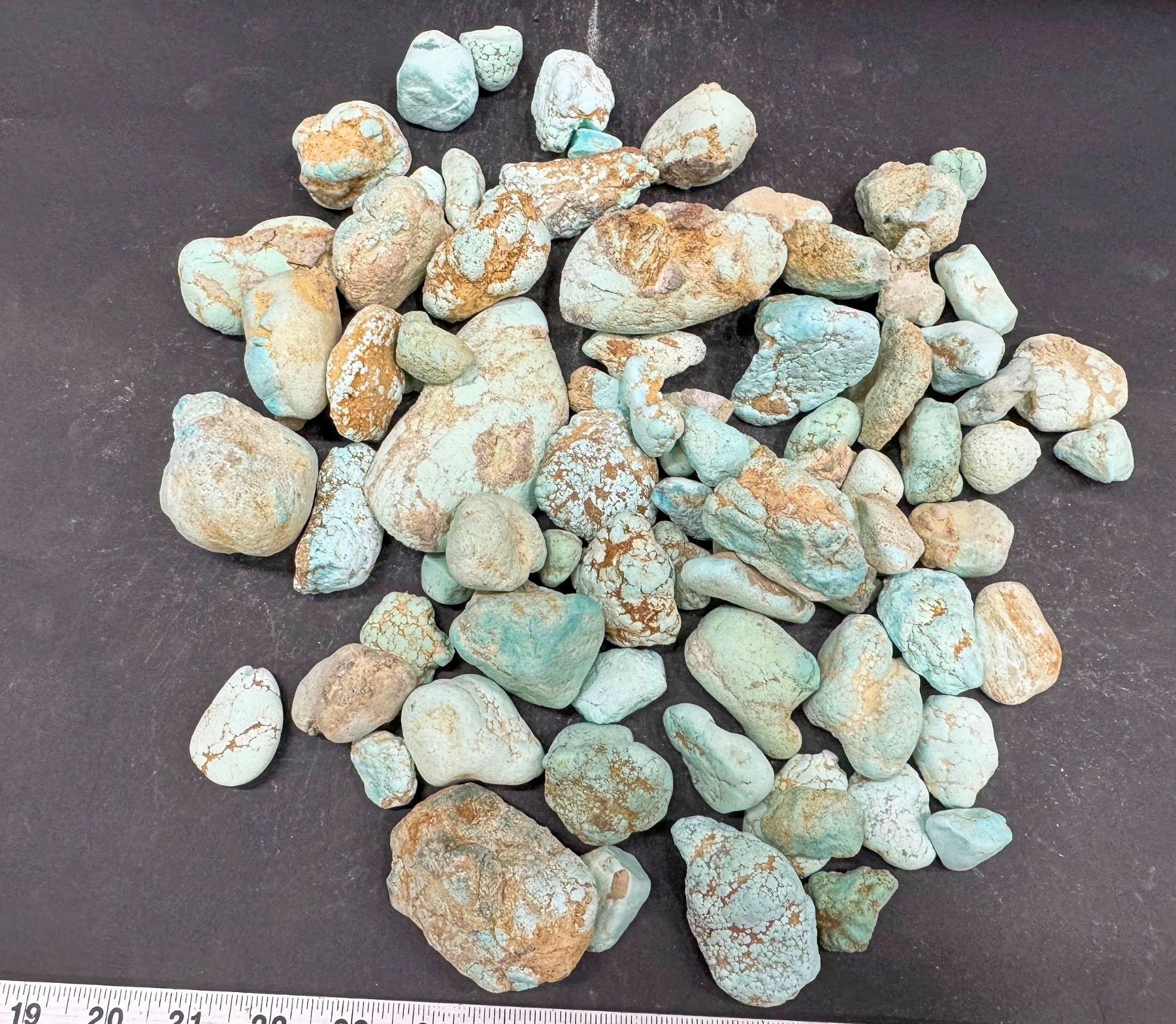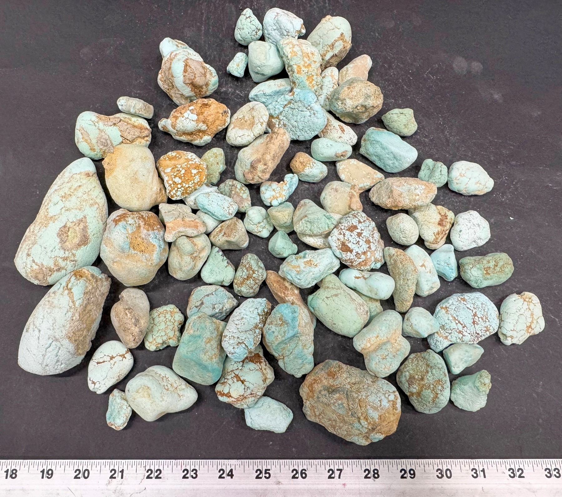 Rough turquoise - stream cobbles, found on the surface of the turquoise deposit. RARE. Approximate weight 7 pounds. From No. 8 turquoise mine, located in Nevada, often considered one of the top turquoise mines in the world. The mine, in Eureka county, north of Carlin, Nevada, was discovered in 1925 and first mined in 1929. Historically, it produced some of the largest nuggets of turquoise ever discovered, including one over 150 pounds. This is very collectible turquoise ñ as no more can ever be mined!†Largest piece about 4.5" x 3" x 2", smallest about 1" x 1" x 1". Info: turquoisematrix.com