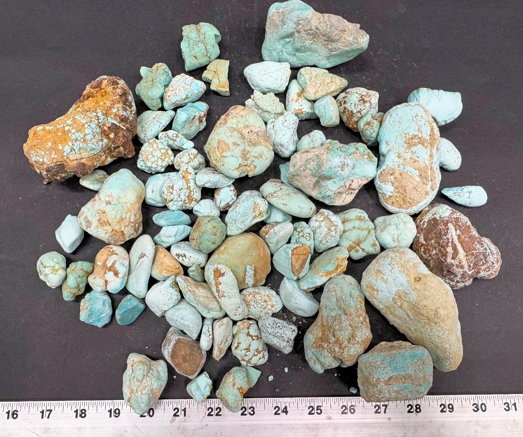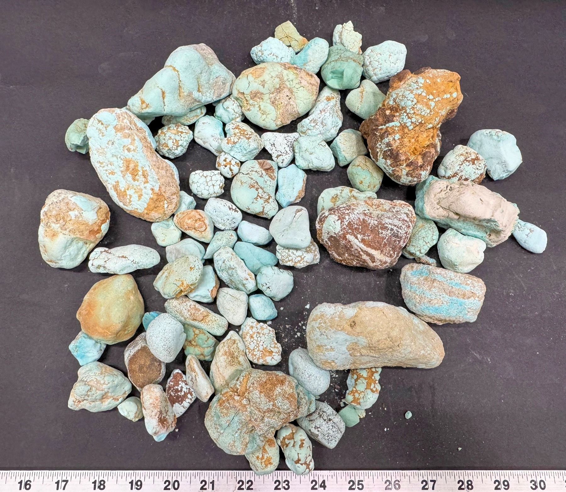 Rough turquoise - stream cobbles, found on the surface of the turquoise deposit. Untreated specimens. RARE. Very Collectible. Approximate weight 7 pounds. From No. 8 turquoise mine, located in Nevada, often considered one of the top turquoise mines in the world. The mine, in Eureka county, north of Carlin, Nevada, was discovered in 1925 and first mined in 1929. Historically, it produced some of the largest nuggets of turquoise ever discovered, including one over 150 pounds. Largest piece about 4" x 3" x 2", smallest about 1" x 1" x 1".