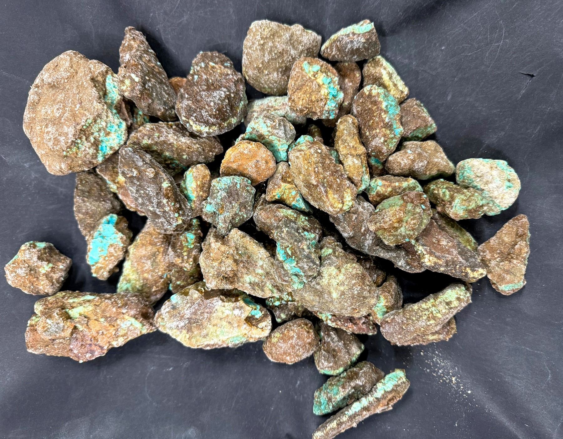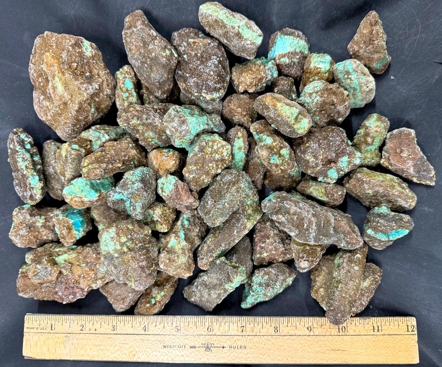 Rough turquoise - treated, small. Approximate weight 6.8 pounds. From No. 8 turquoise mine, located in Nevada, often considered one of the top turquoise mines in the world. Largest piece about 3" x 3" x 1". [ Nevada