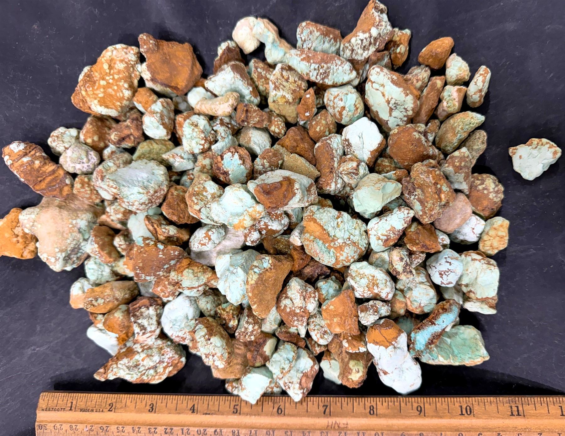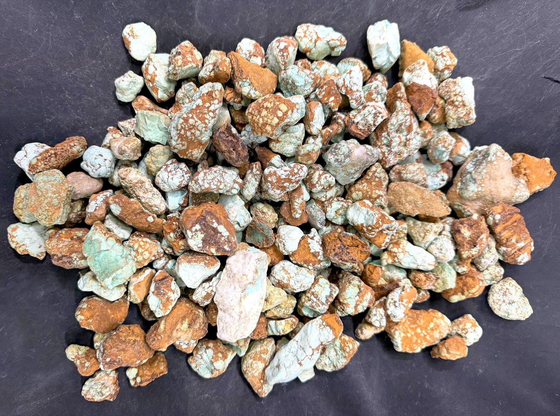 Rough turquoise - raw, untreated nuggets and spider web. Approximate weight 4.6 pounds. From No. 8 turquoise mine, located in Nevada, often considered one of the top turquoise mines in the world. Very collectible turquoise. Largest piece about 2" x 2" x 1.5". [ Nevada