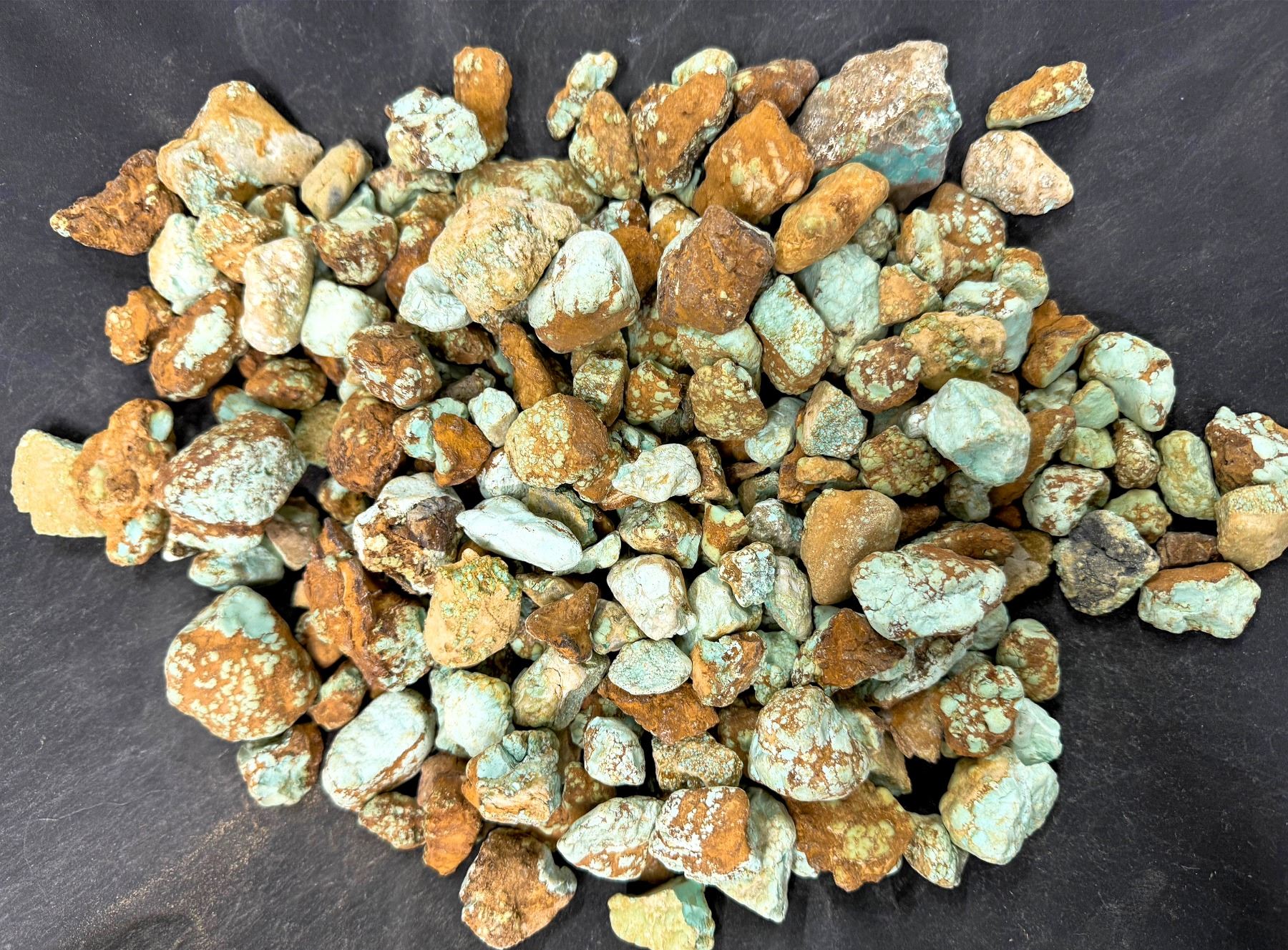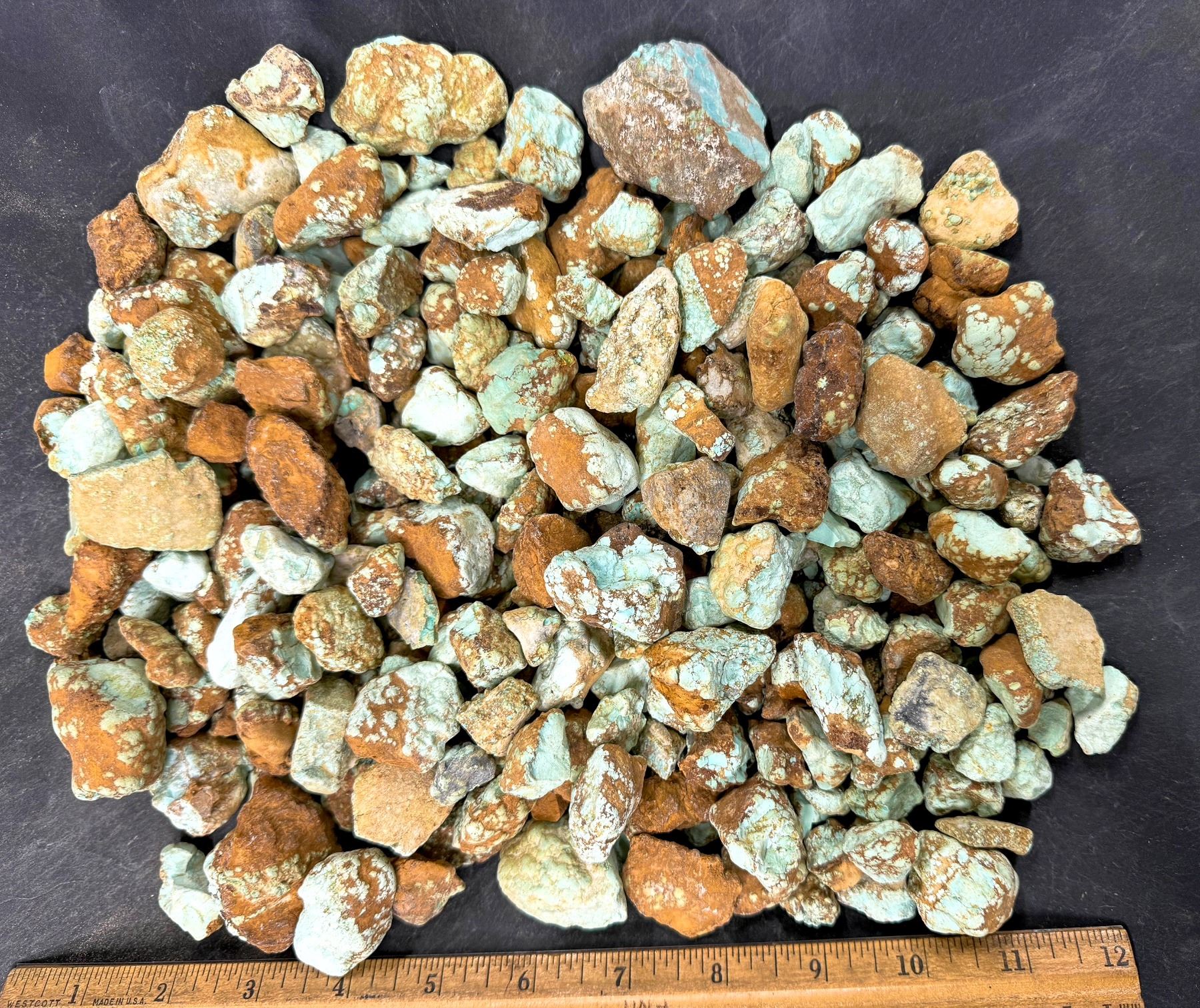 Rough turquoise - raw, untreated nuggets and spider web. Approximate weight 4.4 pounds. From No. 8 turquoise mine, located in Nevada, often considered one of the top turquoise mines in the world. Very collectible turquoise. Largest piece about 2" x 1" x 1". [ Nevada