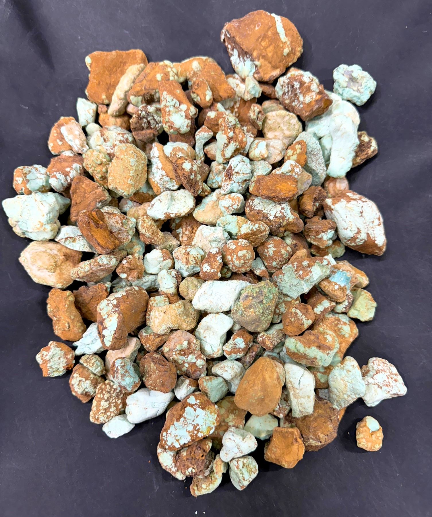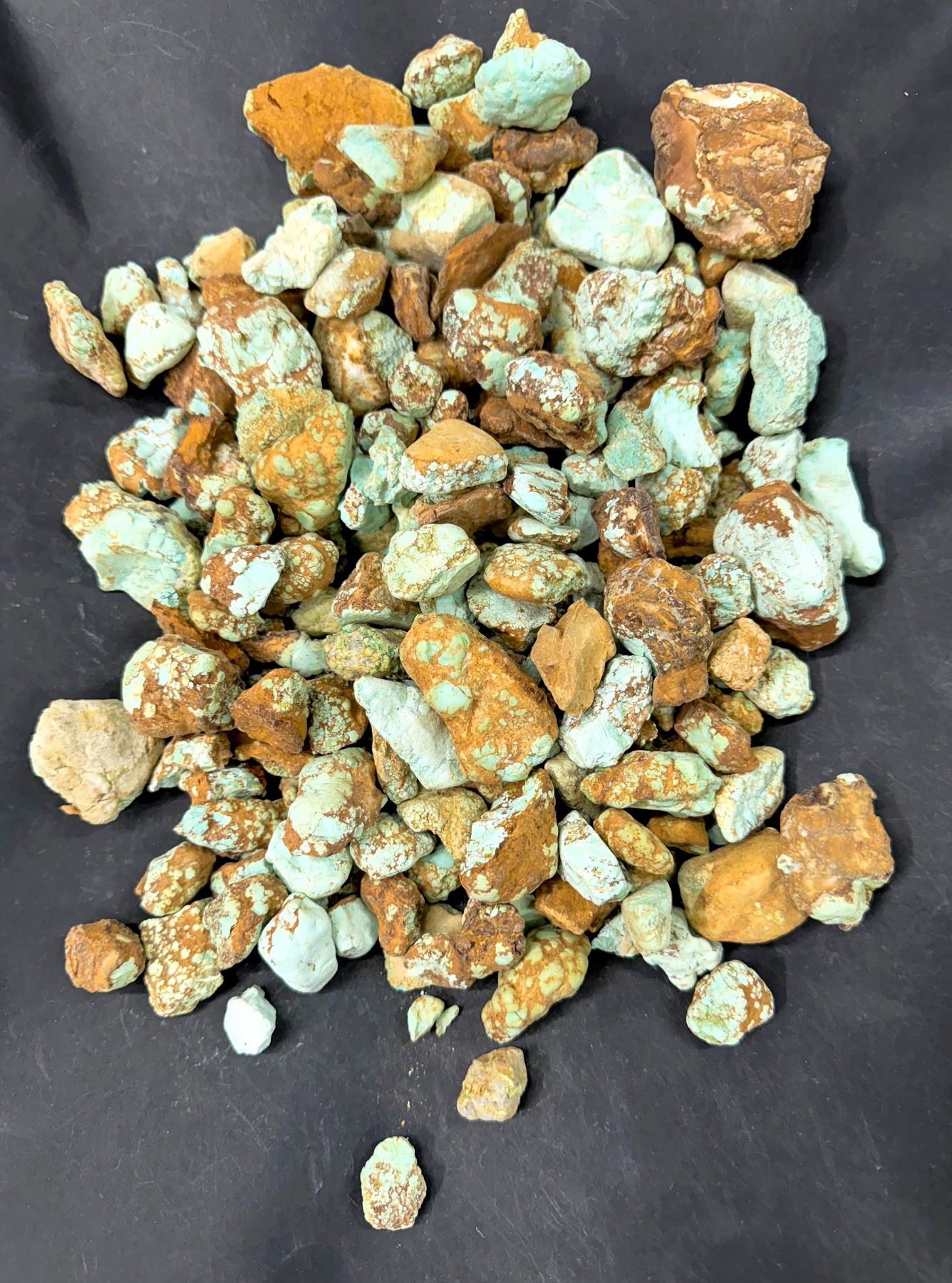 Rough turquoise - raw, untreated nuggets and spider web. Approximate weight 4 pounds. From No. 8 turquoise mine, located in Nevada, often considered one of the top turquoise mines in the world. Very collectible. Largest piece about 2" x 2" x .5". [ Nevada