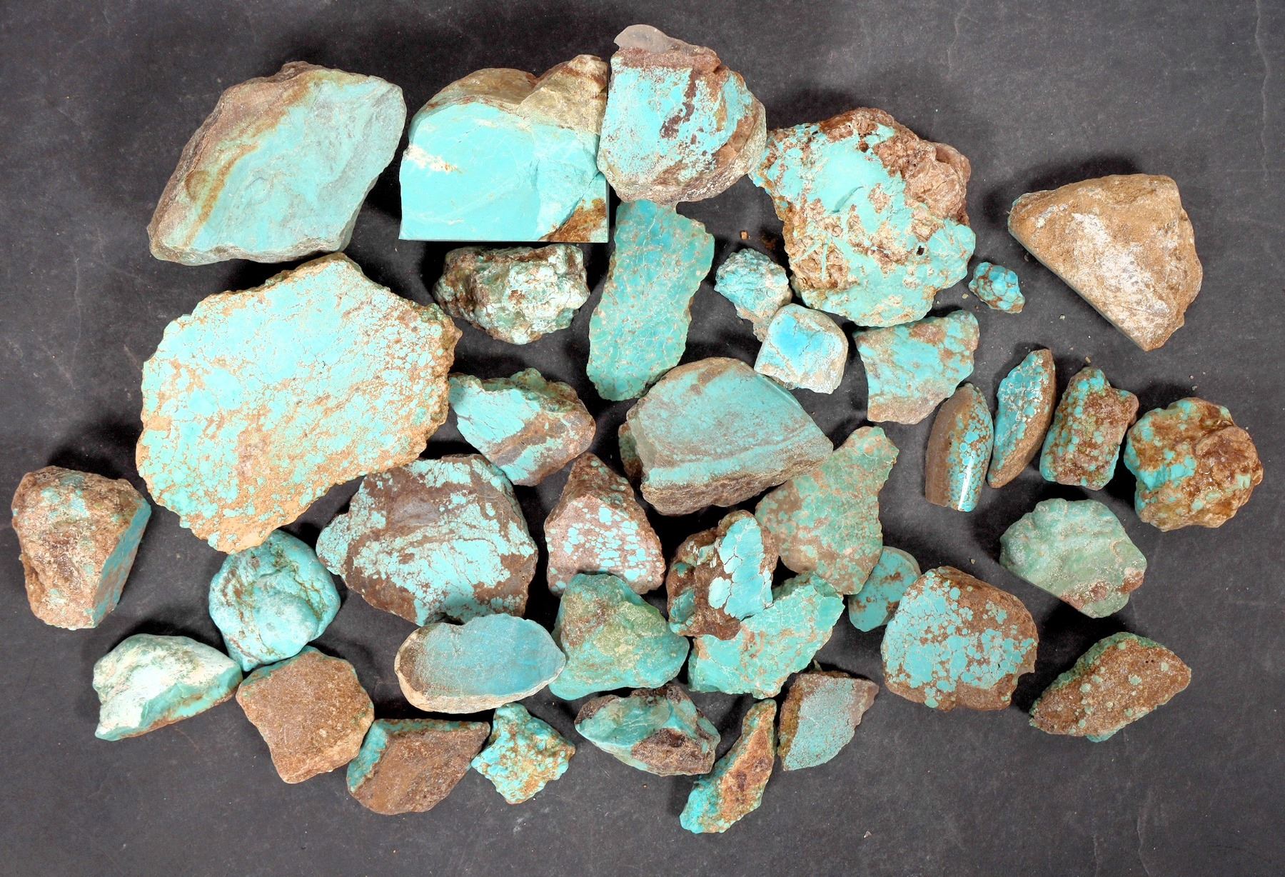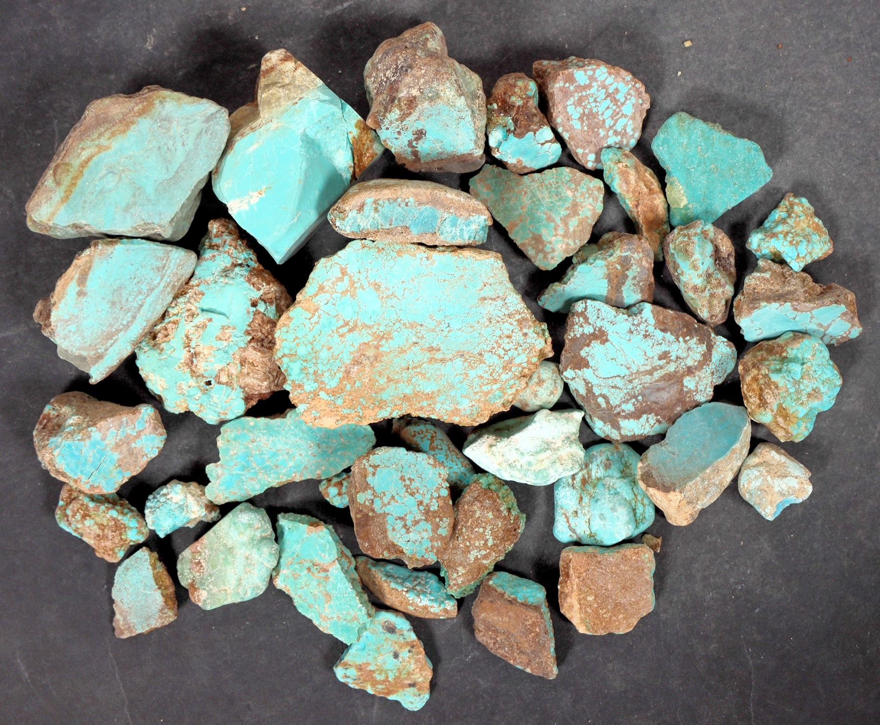 Rough turquoise - medium-large cut pieces, medium blue in color with oxidization on some. Mix of treated and untreated pieces. Approximate weight 3.0 pounds. Pieces in the lot range from around 1" to 3.5" in length. This turquoise originates from the No. 8 turquoise mine of Cortez, Nevada, often considered one of the top turquoise mines in the world. It was previously in storage for 35 years.