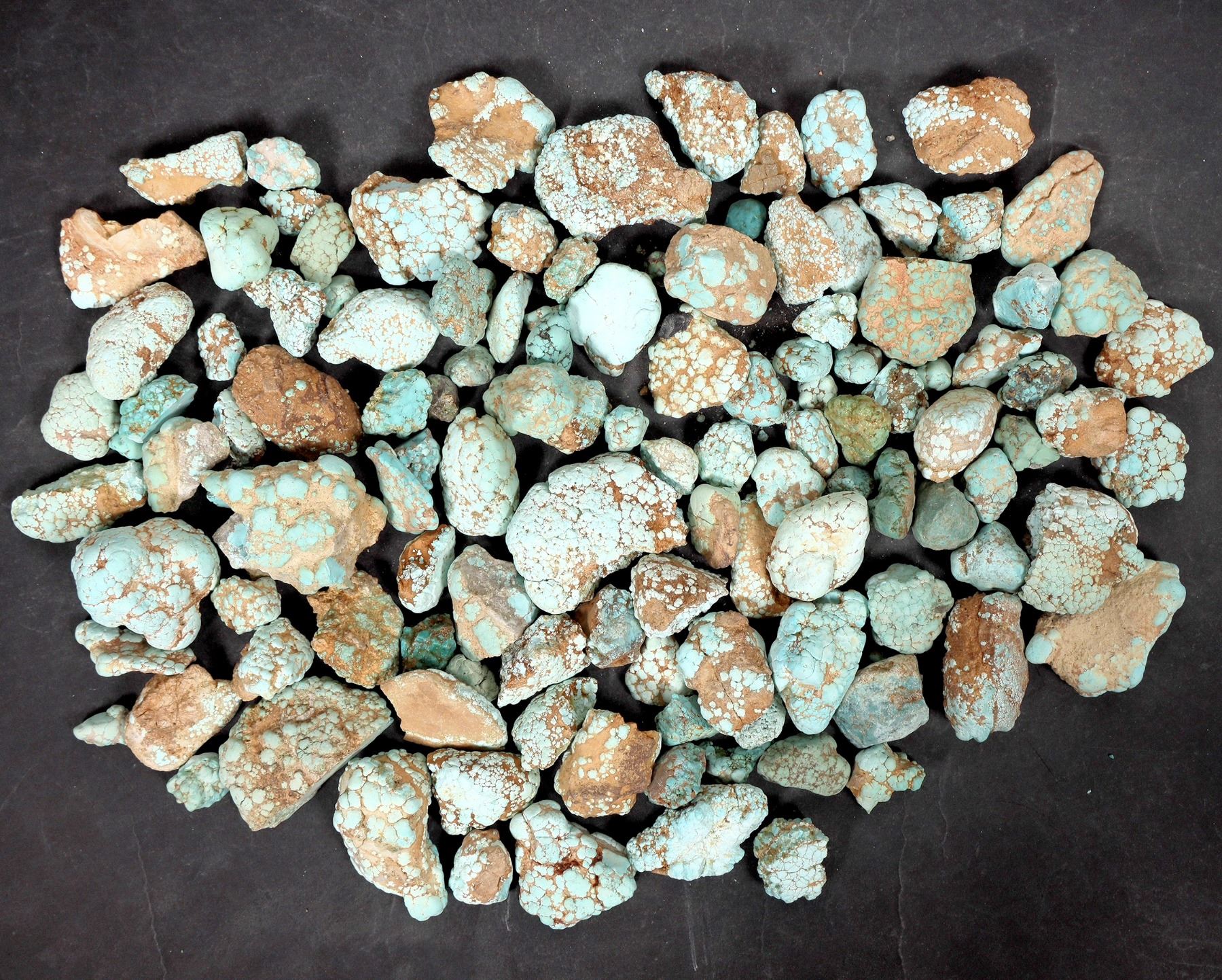 Rough turquoise - raw nuggets. Untreated. Approximate weight 4.0 pounds. Pieces range from around 1" to 2" in length, largest piece in lot measures approx. 2.5" x 2" x 1.5" at widest points. Lovely color on these pieces; see photos. This turquoise originates from the No. 8 turquoise mine of Cortez, Nevada, often considered one of the top turquoise mines in the world. It was previously in storage for 35 years.