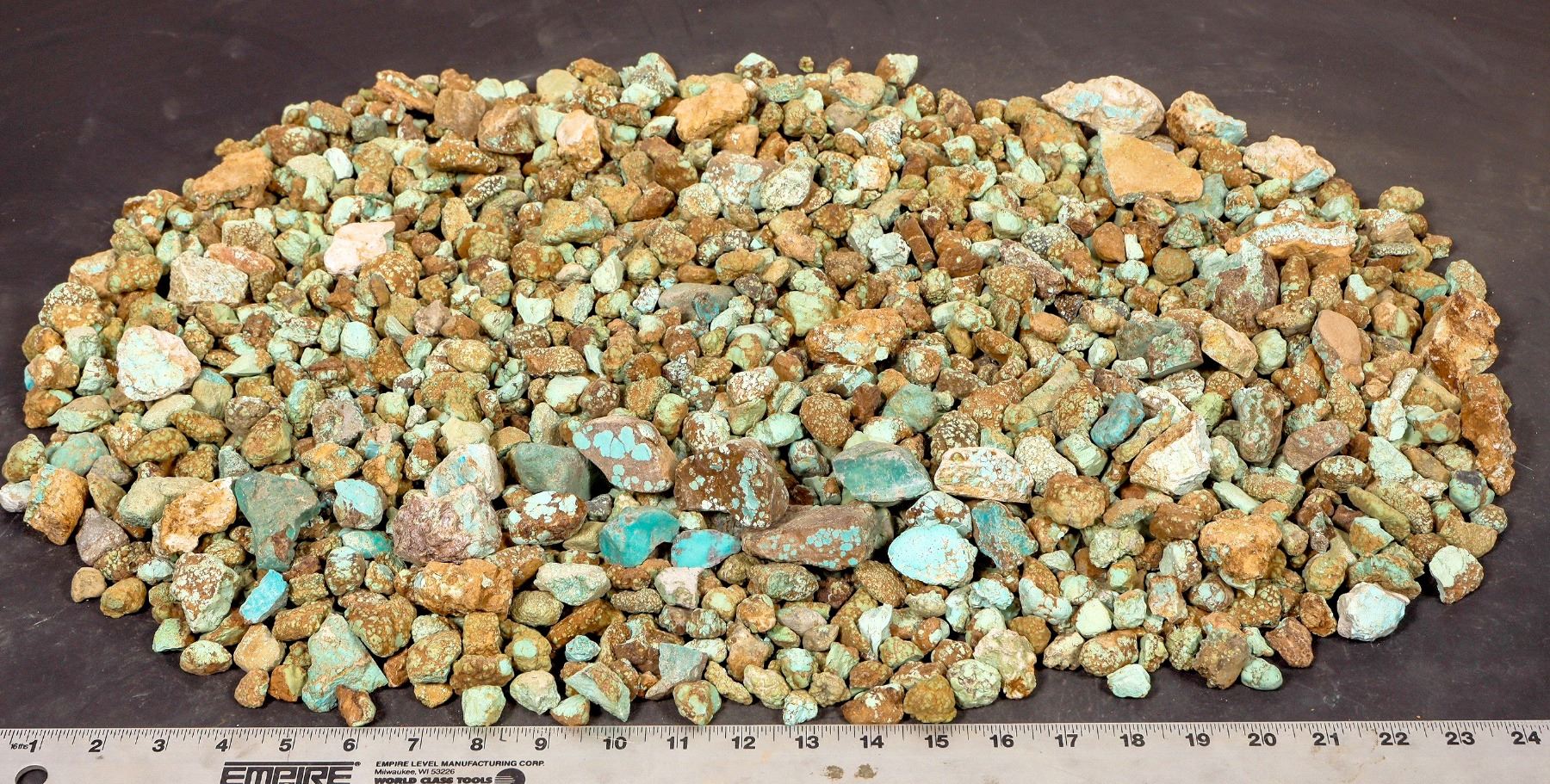 Rough turquoise - small-medium oxidized nuggets and other pieces, light green color. Untreated. Approximate weight 19.4 pounds. Pieces range from around .5" to 2" in length. Lots of variation in size and appearance; see photos. This turquoise originates from the No. 8 turquoise mine of Cortez, Nevada, often considered one of the top turquoise mines in the world. It was previously in storage for 35 years.