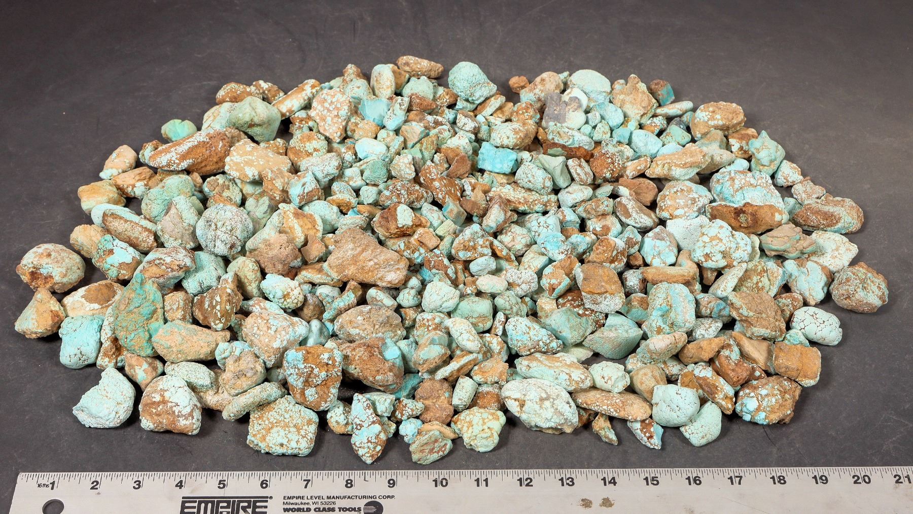 Rough turquoise - small-medium sized nuggets and pieces, untreated. Powder blue in color. Approximate weight 11.2 pounds. Pieces in the lot range from around .5" to 2.5" in length. These would make excellent pieces for tumbling. This turquoise originates from the No. 8 turquoise mine of Cortez, Nevada, often considered one of the top turquoise mines in the world. It was previously in storage for 35 years.