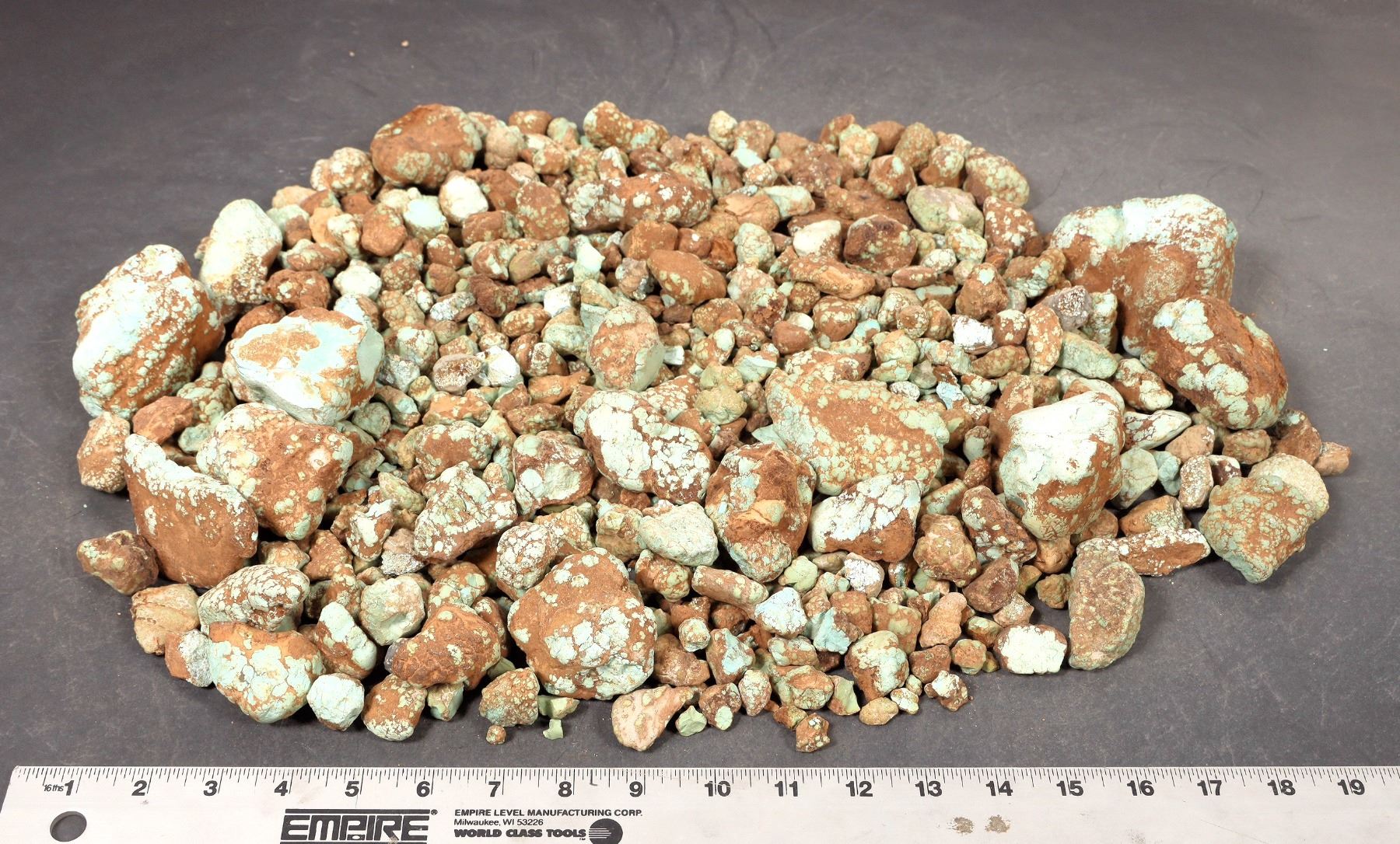 Rough turquoise - oxidized nuggets, both small and large, untreated. Light blue with a green cast. Approximate weight 12.6 pounds. Pieces in the lot range from around .5" to 3.5" in length. Lots of size variation in this lot; the small pieces would make excellent material for tumbling. This turquoise originates from the No. 8 turquoise mine of Cortez, Nevada, often considered one of the top turquoise mines in the world. It was previously in storage for 35 years.