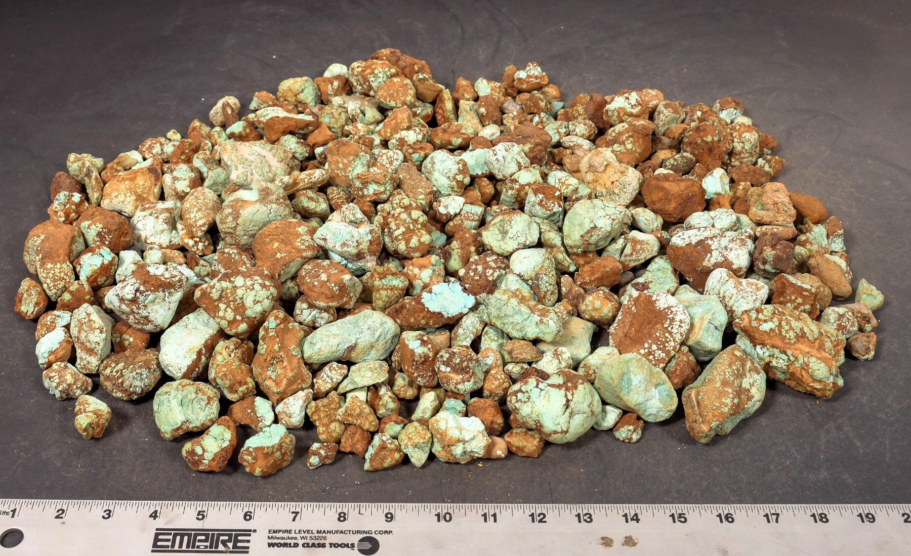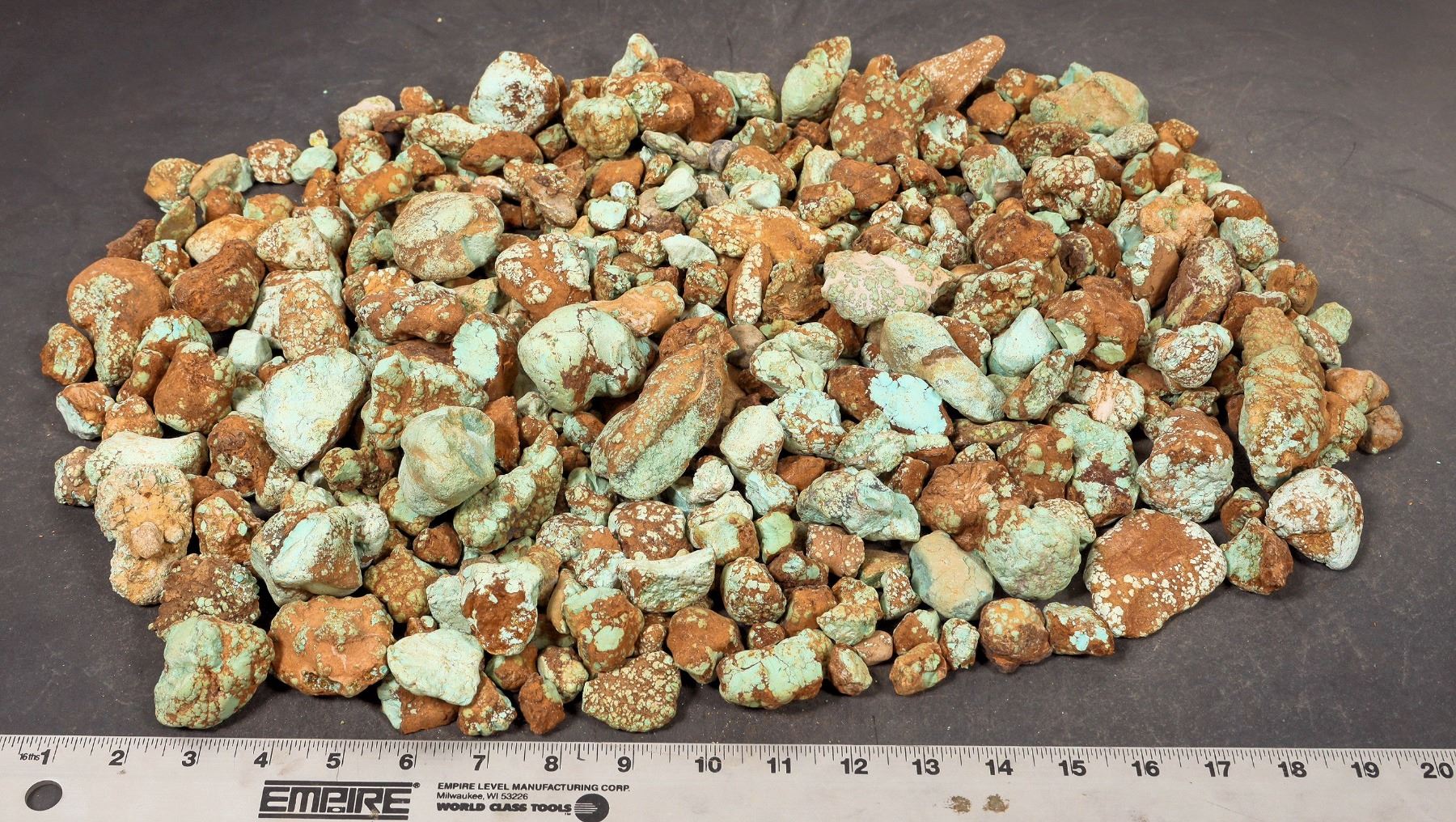 Rough turquoise - small-medium oxidized nuggets, light green color with some spiderweb. Untreated. Approximate weight 12.8 pounds. Pieces range from around .5" to 3" in length, largest piece in lot measures approx. 3" x 1.5" x 1.25" at widest points. This turquoise originates from the No. 8 turquoise mine of Cortez, Nevada, often considered one of the top turquoise mines in the world. It was previously in storage for 35 years.