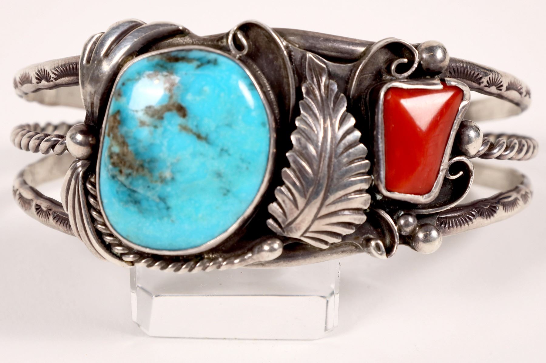 Nice unsigned turquoise, red stone and silver bracelet with 3 side bands. 2.5" wide.