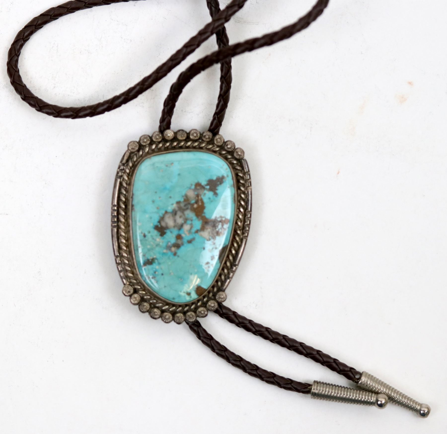 Circa 1970s vintage turquoise and silver bolo tie. Brown leather cord; silver is unmarked and unsigned.. 46 x 65 mm. [