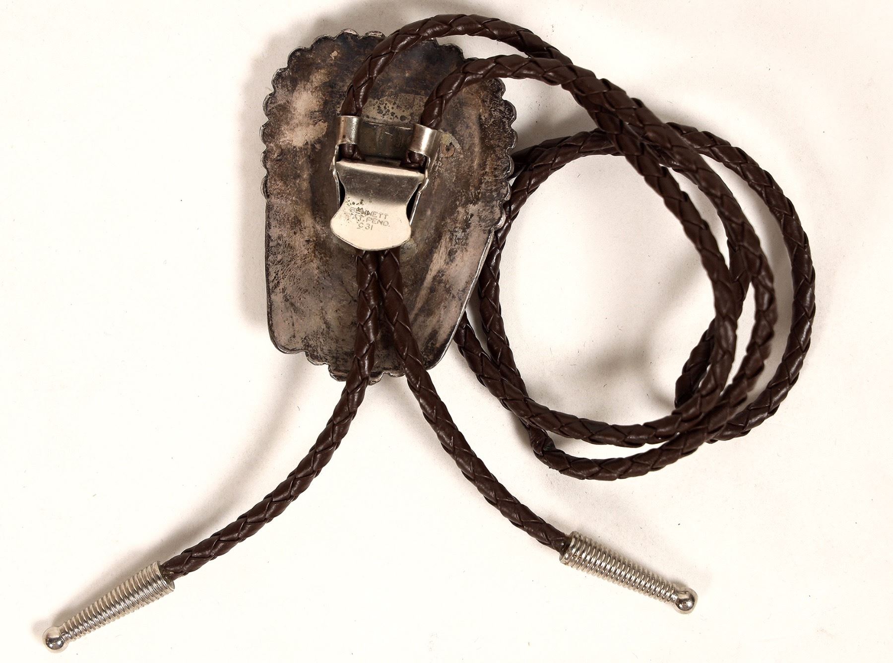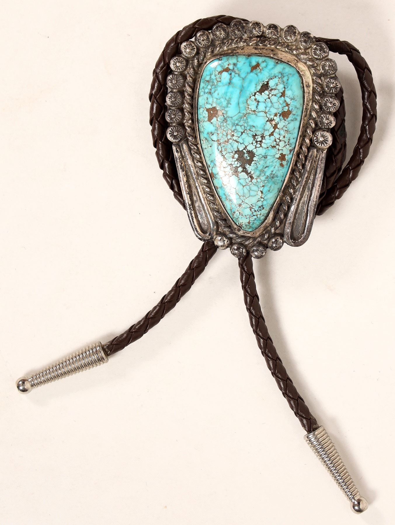 Vintage circa 1970s turquoise and silver bolo tie. Unmarked and unsigned, brown leather cord. 47 x 65 mm.[