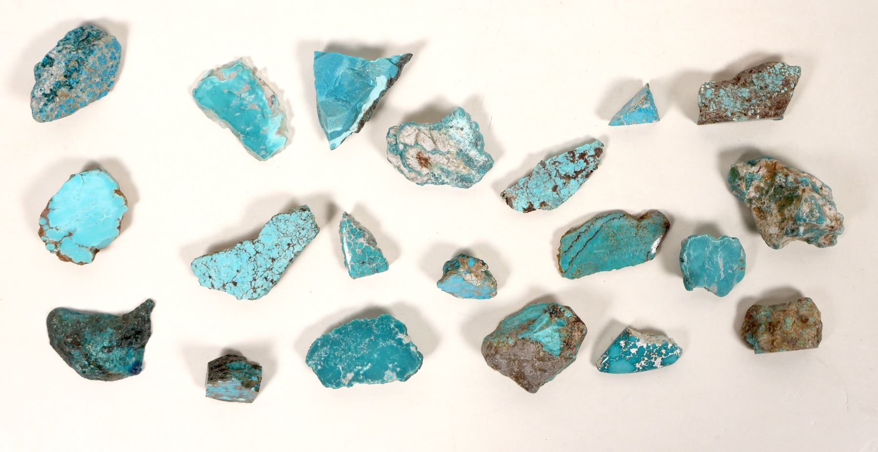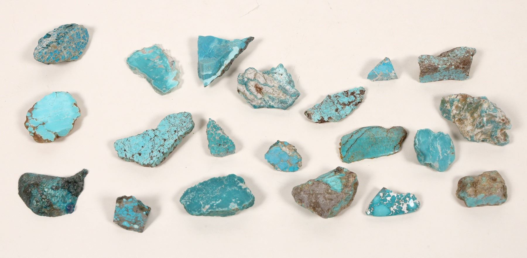 20 pieces of high-grade, gorgeous deep blue Natural Turquoise from the No. 8 Turquoise Mine, located in the Lynn Mining District in northern Eureka County in Nevada. The #8 Mine produced what is often considered some of the highest grade turquoise known. The turquoise in this sale was warehoused for the last 35-40 years and came from one of the most prized turquoise deposits ever found in the world. Very collectible. All of have one or more polished or cut & polished surface. Small sized pieces. Most appear to be treated/stabilized. Nice group. Total weigh approx. 9.5 ozs.