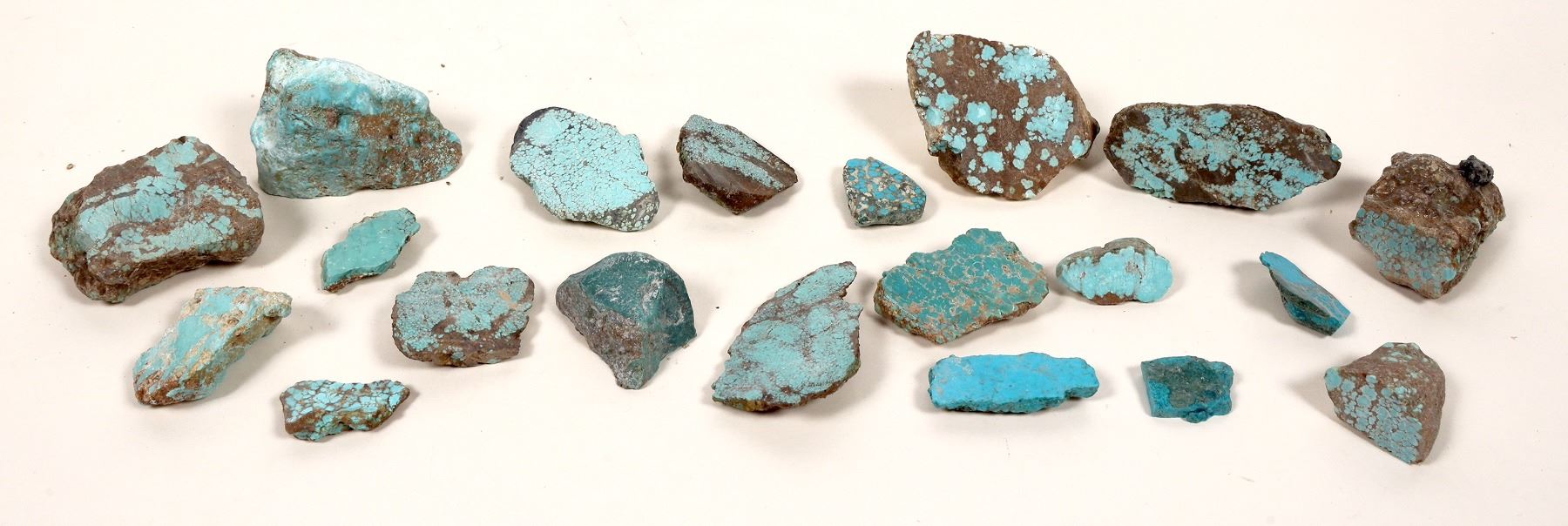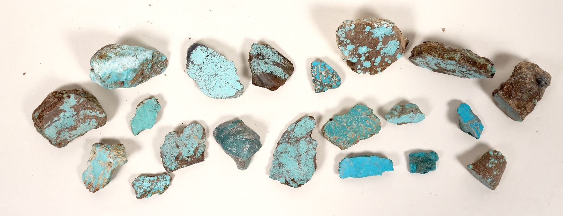 20 pieces of hand selected, mostly light blue Natural Turquoise from the No. 8 Turquoise Mine, located in the Lynn Mining District in northern Eureka County in Nevada. The #8 Mine produced what is often considered some of the highest grade turquoise known. The turquoise in this sale was warehoused for the last 35-40 years and came from one of the most prized turquoise deposits ever found in the world. Very collectible. All of have one or more polished or cut & polished surface. Sizes vary - largest pieces are about 3 x 2 x 2 inches. Some pieces appear to be treated/stabilized. Nice Variety. Total weigh approx. 1.6 lbs.