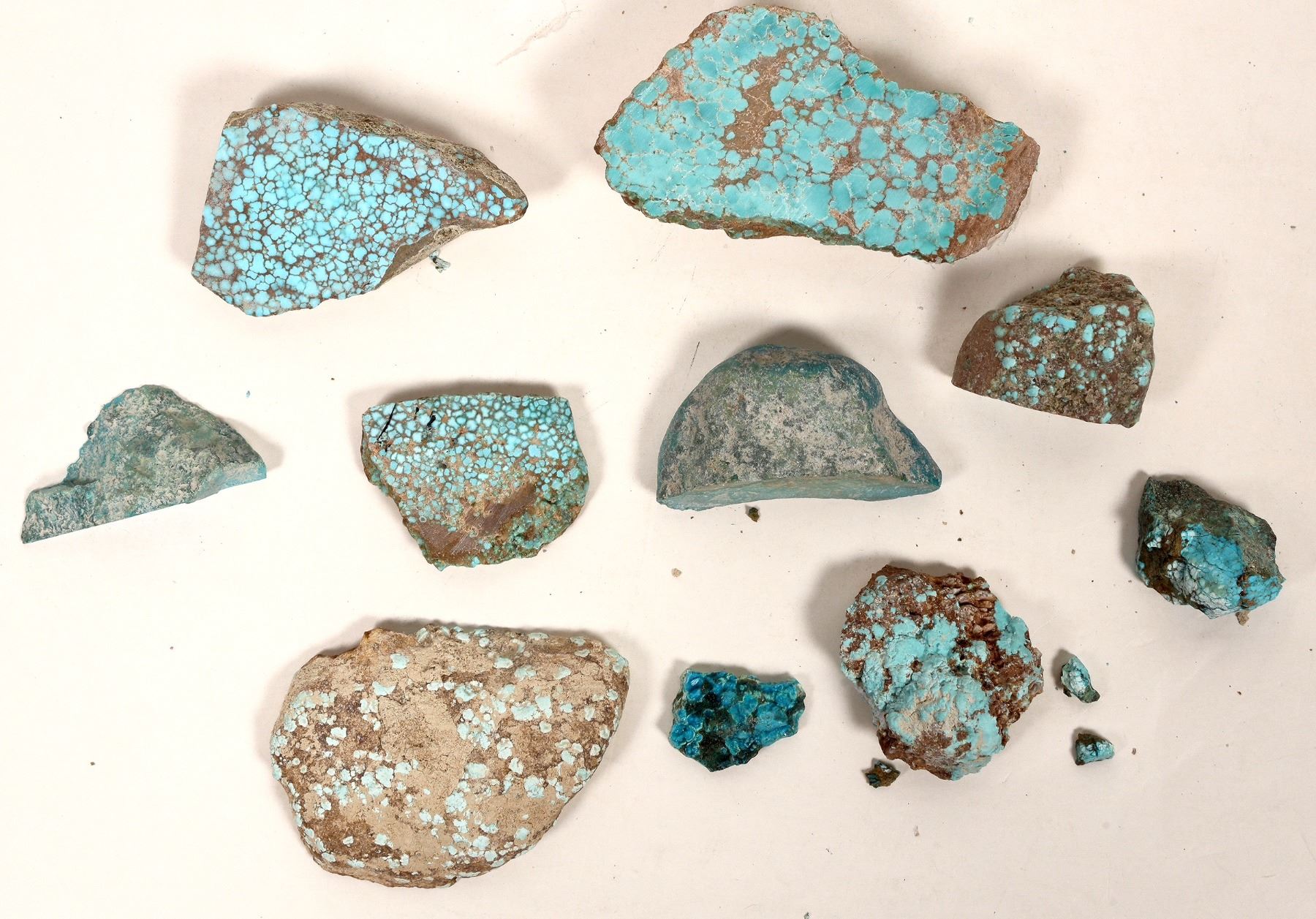 10 pieces of High-grade, blue spider web Natural Turquoise from the No. 8 Turquoise Mine, located in the Lynn Mining District in northern Eureka County in Nevada. The #8 Mine produced what is often considered some of the highest grade turquoise known. The turquoise in this sale was warehoused for the last 35-40 years and came from one of the most prized turquoise deposits ever found in the world. Very collectible. All of have one or more cut surfaces, most have sought after spider web matrix. Sizes vary - largest pieces are approx. 3-4 inches x 2-3 x .25-.5 inches. Some pieces are treated/stabilized. Nice Variety. Weighs about 9 oz. total.