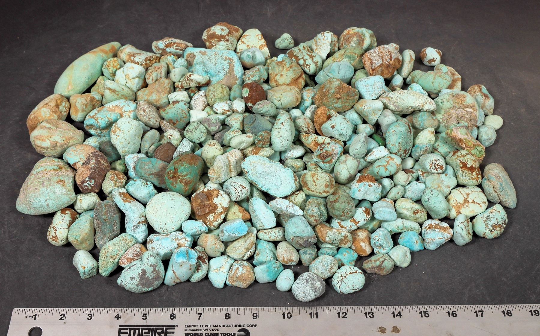 Rough turquoise - stream cobbles, mostly untreated. Pieces range from medium to light blue in color, greenish cast. Approximate weight 12.2 pounds. Pieces range from around 1" to 4.5" in length, largest piece in lot measures approx. 4.5" x 1.75" x 1.5" at widest points. This turquoise originates from the No. 8 turquoise mine of Cortez, Nevada, often considered one of the top turquoise mines in the world. It was previously in storage for 35 years.