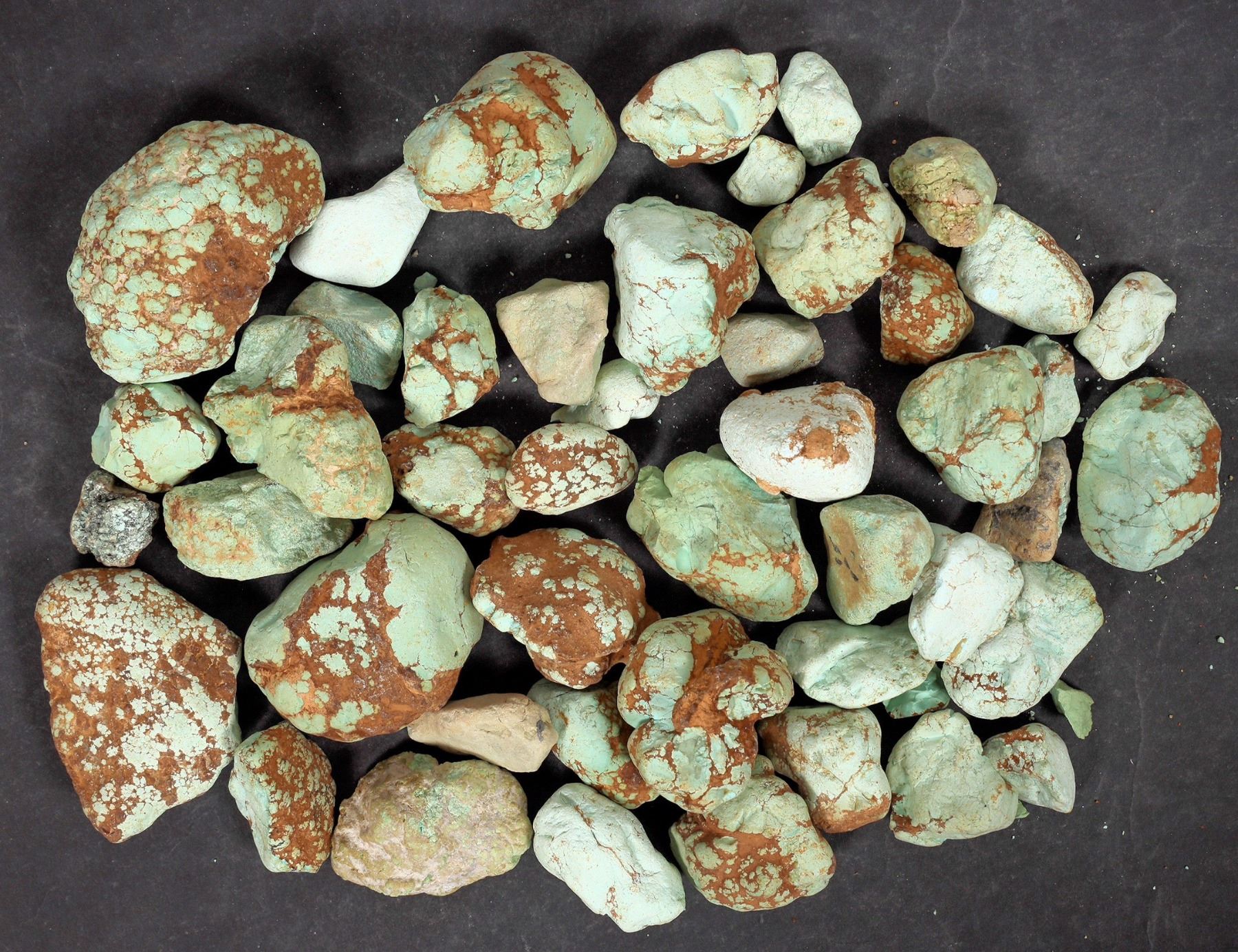 Rough turquoise - stream cobbles, mostly untreated. Cobbles are light green in color with some oxidization. Approximate weight 3.4 pounds. Pieces range from around 1" to 3" in length, largest piece in lot measures approx. 3" x 2" x 1.5" at widest points. This turquoise originates from the No. 8 turquoise mine of Cortez, Nevada, often considered one of the top turquoise mines in the world. It was previously in storage for 35 years.